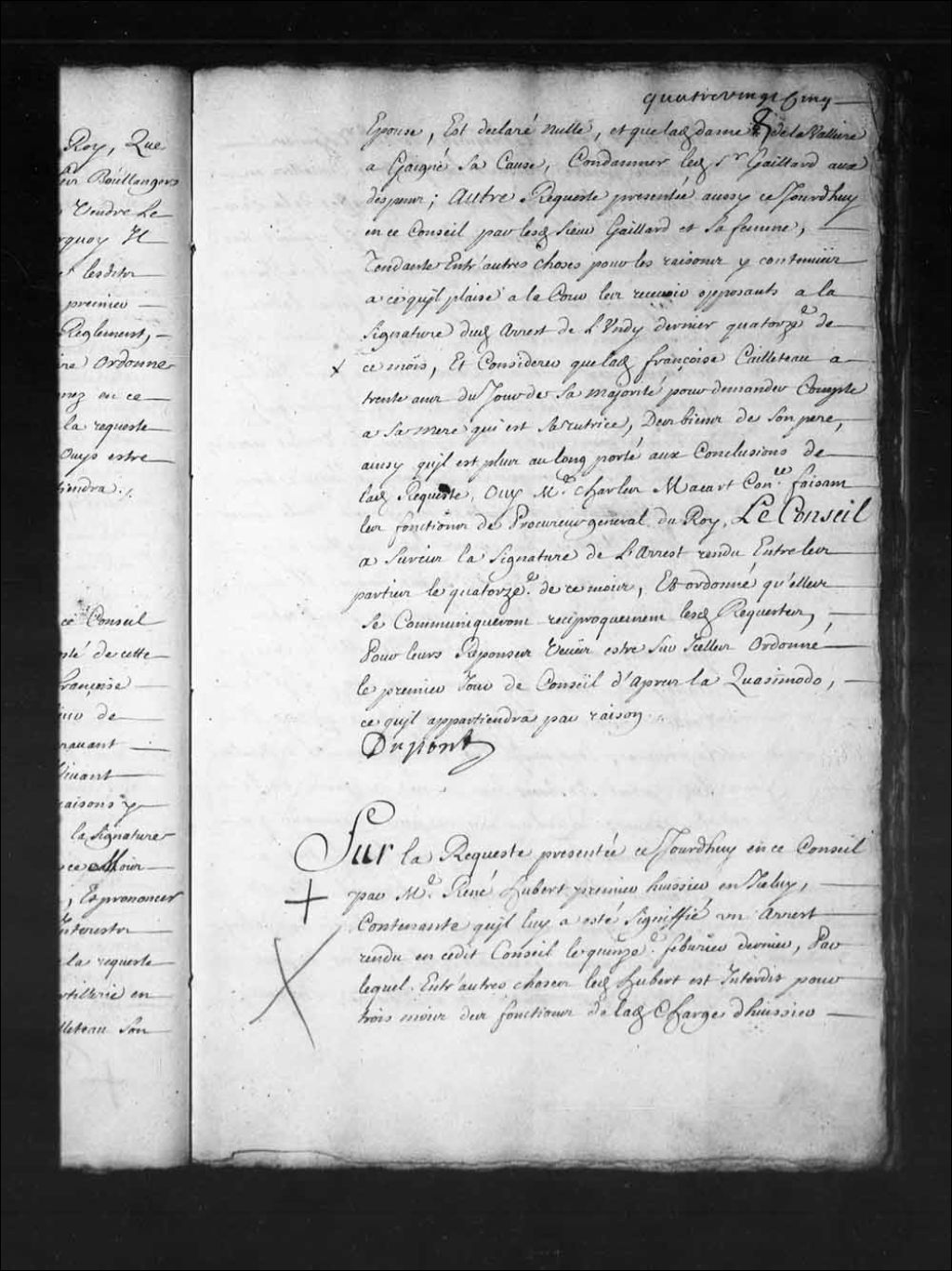 - Transcription du texte avec orthographe modernisée : «Sur la requête présentée ce jourd'hui en ce Conseil par maître René Hubert premier huissier en icelui, contenante qu'il lui a été signifié un arrêt rendu en ce dit Conseil le quinze février dernier, par lequel entre autres choses ledit Hubert est interdit pour trois mois des fonctions de ladite charge d'huissier pour avoir fait à la requête de messire Thomas Thiboult prêtre, faisant les fonctions curiales en cette ville, une signification au greffe de la Cour le quatrième janvier aussi dernier, qu'il requiert très humblement la Cour d'être persuadée qu'il n'a jamais eu la pensée ni n'a jamais prétendu faire ladite signification témérairement, contre son devoir n'y le respect qu'il doit à la Cour, puisque quand elle lui fut donnée par ledit sieur Thiboult il lui dit qu'il ne croyait pas que monsieur le greffier la voulut recevoir, ce qui est si vrai que ledit Hubert fut jusqu'à trois fois différentes audit greffe sans y avoir voulu laisser ladite signification parce que ledit greffier n'y était pas, et qu'enfin l'y ayant trouvé, il lui dit en ces mots, n'est ce pas une signification que vous m'apportés de la part de Monsieur le curé, à quoi ledit Hubert lui répondit qu'oui s'il la voulait recevoir et lui ayant répliqué qu'oui il lui donna, et que s'il eut fait la moindre difficulté ledit Hubert se serait bien donné de garde de la lui donner; que la Cour ne peut disconvenir que depuis trente-six ans passés que ledit Hubert à l'honneur d'être huissier audit Conseil, elle n'a jamais entendu aucunes plaintes à l'encontre de lui pour le manque de respect qu'il lui doit, ou pour ne se pas bien acquitter de sa charge, sur quoi il supplie très humblement la Cour de faire attention, et à ce qu'il lui plaise Lever ladite interdiction pour le temps qui reste à expirer, ce faisant lui permettre de continuer l'exercice de ladite charge de premier huissier audit Conseil, aux protestations qu'il réitère qu'il n'a jamais faits n'y prétendu faire rien avec témérité, contre son devoir n'y le respect qu'il doit à la Cour et qu'il ne le fera jamais, ouï maître Charles Macart (Macard) conseiller faisant les fonctions de procureur général du Roi, le Conseil ayant égard à ladite requête, de grâce a levé l'interdiction portée par l'arrêt du quinzième février dernier, et a rétabli ledit Hubert dans ses fonctions de premier huissier audit Conseil comme il était avant ledit arrêt. DUPONT.»