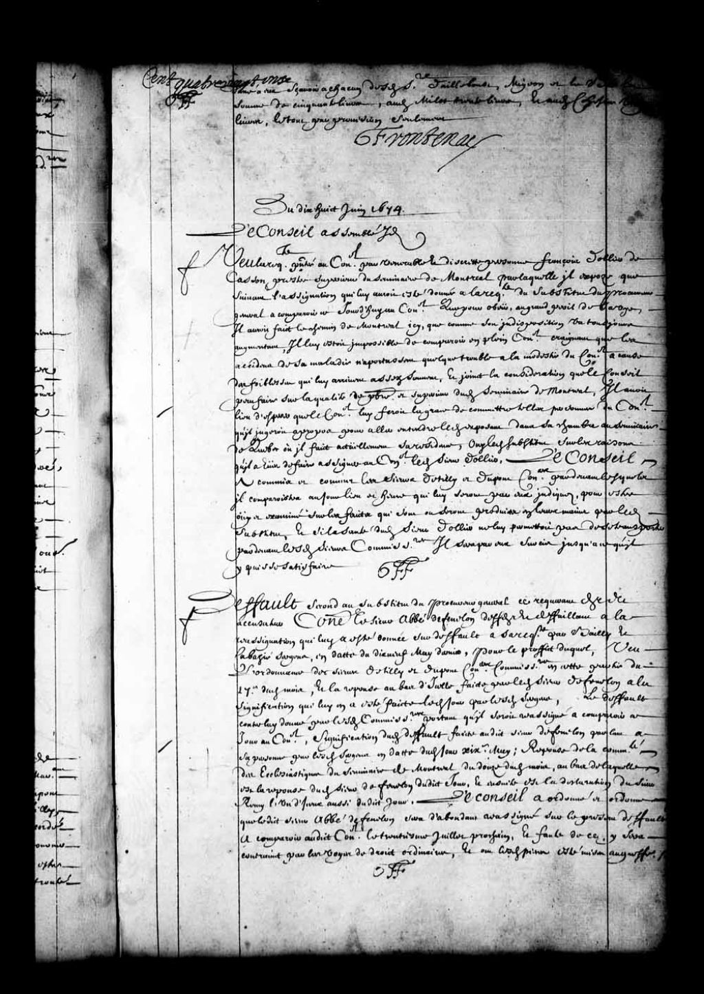 - Transcription du texte avec orthographe modernisée : «Du dix-huit juin 1674. Le Conseil assemblé idem. Vu la requête présentée au Conseil par vénérable et discrète personne François Dollier de Casson prêtre supérieur du séminaire de Montréal par laquelle il expose que suivant l'assignation qui lui aurait été donnée à la requête du substitut du procureur général à comparaître ce jourd'hui au Conseil; que pour obéir, au grand péril de sa vie, il aurait fait le chemin de Montréal ici, que comme son indisposition va toujours augmentant, il lui était impossible de comparaître en plein Conseil craignant que les accidents de sa maladie n'apportassent quelque trouble à la modestie du Conseil à cause des faiblesses qui lui arrivent assez souvent, et joint la considération que le Conseil peut faire sur la qualité de prêtre et supérieur dudit séminaire de Montréal, il avait lieu d'espérer que le Conseil lui ferait la grâce de commettre telles [...]