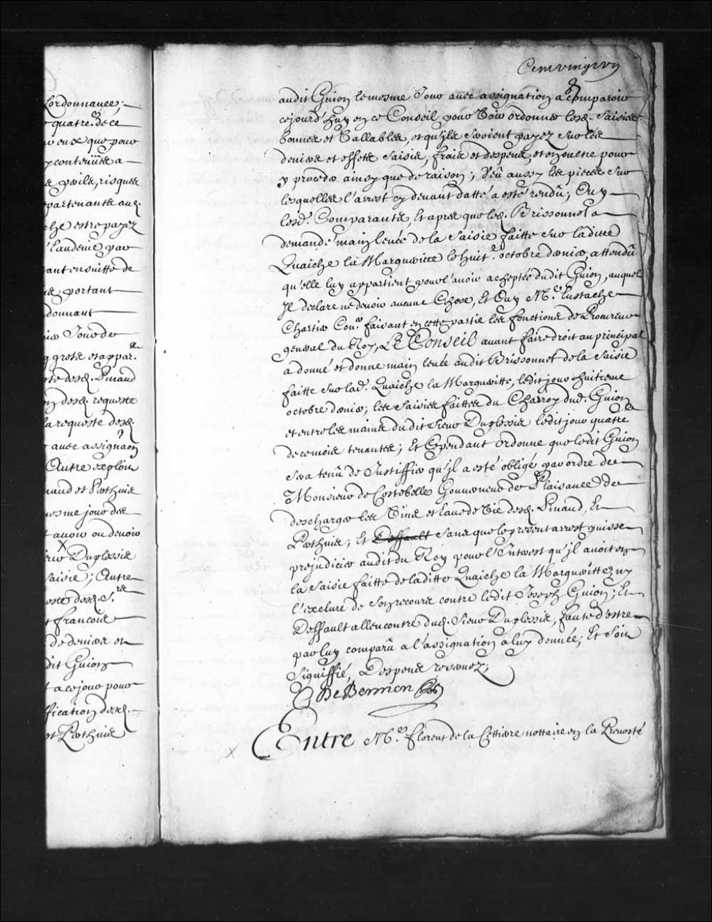 - Transcription du texte avec orthographe modernisée : «Entre maître Florent de LACETIERRE (Lacetière) notaire en la prévôté de cette ville au nom et comme ci-devant procureur de défunt Daniel de grezolon (Greysolon), écuyer sieur Duluth vivant capitaine d'une compagnie des troupes du détachement de la marine en ce pays et à présent curateur en sa succession et porteur de la procuration passée par le sieur Claude Grezolon (Greysolon) écuyer sieur de Latourette, à Jean Soumande marchand à Montréal en date du quinzième avril de l'année dernière opposant à l'exécution de l'arrêt rendu par défaut en ce Conseil le neuvième juillet mille sept cent huit, d'une part; et maître Guillaume GAILLARD conseiller en ce dit Conseil au nom et comme procureur des sieurs intéressés en la ferme de ce pays, au bail de maître Jean Oudiette ci-devant fermier général du domaine d'occident défendeur d'autre part; vu ledit arrêt par lequel en adjugeant le profit [...]