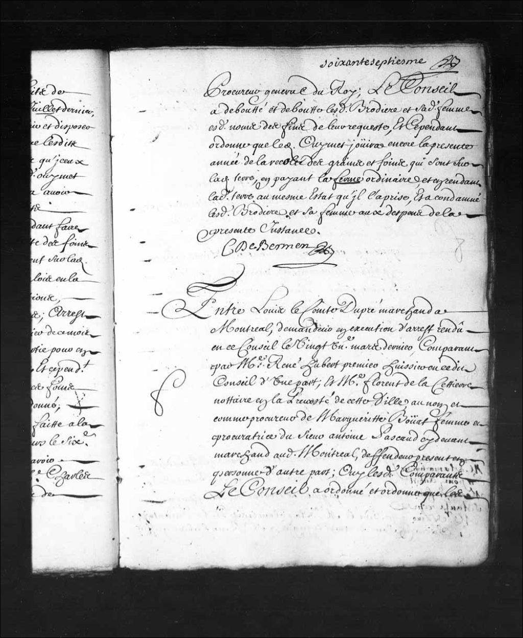 Transcription du texte avec orthographe modernisée : «Entre Louis Lecomte DUPRÉ marchand à Montréal, demandeur en exécution d'arrêt rendu en ce Conseil le vingt et unième mars dernier, comparant par maître René Hubert premier huissier en ce dit Conseil d'une part; et maître Florent de LACETTIERRE (Lacetière) notaire en la prévôté de cette ville, au nom et comme procureur de Marguerite Bouat femme et procuratrice du sieur Antoine Pascaud (Pacaud) ci-devant marchand audit Montréal, défendeur présent en personne d'autre part; ouï lesdits comparants, le Conseil a ordonné et ordonne que les pièces des parties seraient jointes au procès, et mises en les mains de maître François Mathieu Martin Delino (De Lino) conseiller rapporteur; dépens réservés. C. DE BERMEN»