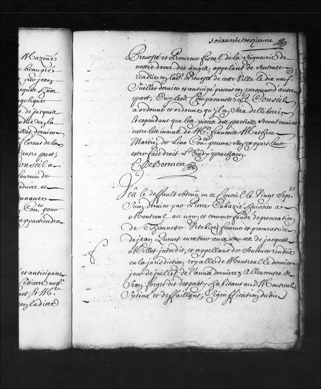 - Transcription du texte avec orthographe modernisée : «Vu le défaut obtenu en ce Conseil le vingt-septième juin dernier par Pierre Cabazié (Cabazier) huissier à Montréal au nom et comme fondé de procuration de Etiennette Hurtubise femme et procuratrice de Jean Quenet curateur aux causes de Jacques Millot (Milot) interdit, et appelant de sentence rendue en la juridiction royale de Montréal le dernier jour de juillet de l'année dernière; à l'encontre de Jean forget dit despasti (Despatis, Despaty) habitant audit Montréal; intimé et défaillant; signification dudit défaut faite à la requête dudit Cabazié (Cabazier) audit forget par Lepallieur (Lepailleur) huissier audit Montréal le quinzième juillet aussi dernier avec assignation à comparaître ce jourd'hui en ce Conseil, et après que maître Florent de Lacettierre (Lacetière) notaire en la prévôté de cette ville faisant pour ledit Cabazié (Cabazier) a requis le profit dudit défaut; le Conseil avant d'adjuger le profit dudit défaut, a ordonné et ordonne qu'il en sera délibéré, et qu'à cet effet les pièces dudit appelant seront mises en les mains de maître Eustache Chartier de Lotbinière conseiller pour à son rapport être ordonné lundi prochain ce qu'il appartiendra par raison. C. DE BERMEN»