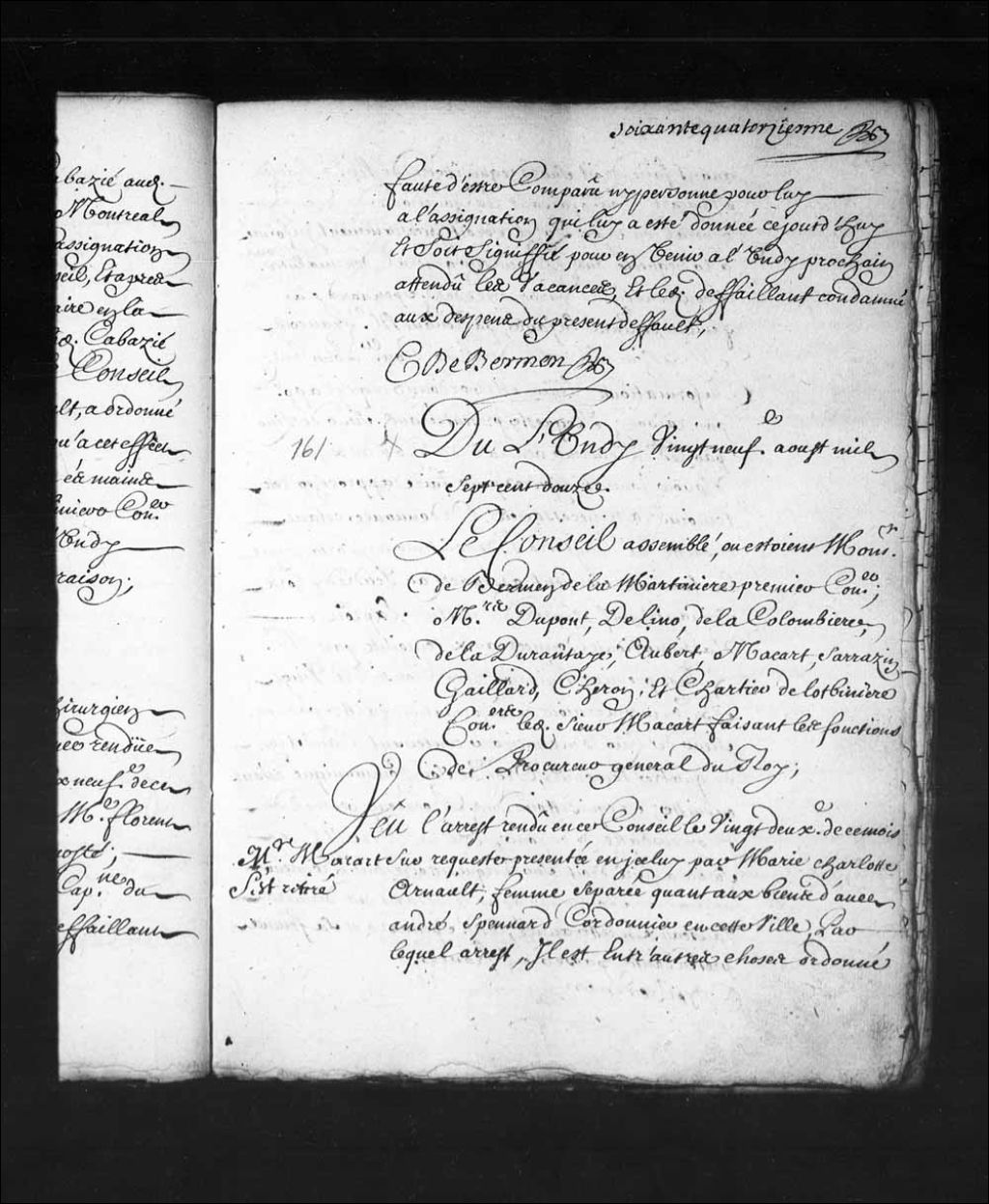 - Transcription du texte avec orthographe modernisée : «Du lundi vingt-neuvième août mille sept cent douze. Le Conseil assemblé où étaient Monsieur de Bermen de la Martinière premier conseiller, Messieurs Dupont, Delino (De Lino), de la Colombière, de Ladurantaye, Aubert, Macart (Macard), Sarrazin Gaillard, Cheron, et Chartier de Lotbinière conseillers ledit sieur Macart (Macard) faisant les fonctions de procureur général du Roi. Monsieur Macart (Macard) s'est retiré. Vu l'arrêt rendu en ce Conseil le vingt-deuxième de ce mois sur requête présentée en icelui par Marie Charlotte Arnault (Arnaud), femme séparée quant aux biens d'avec André Spennard (Spénard) cordonnier en cette ville, par lequel arrêt, il est entre autres choses ordonné avant faire droit sur le réquisitoire de maître Charles Macart (Macard) conseiller faisant les fonctions de procureur général du Roi; qu'il serait incessamment informé à la requête dudit procureur général [...]