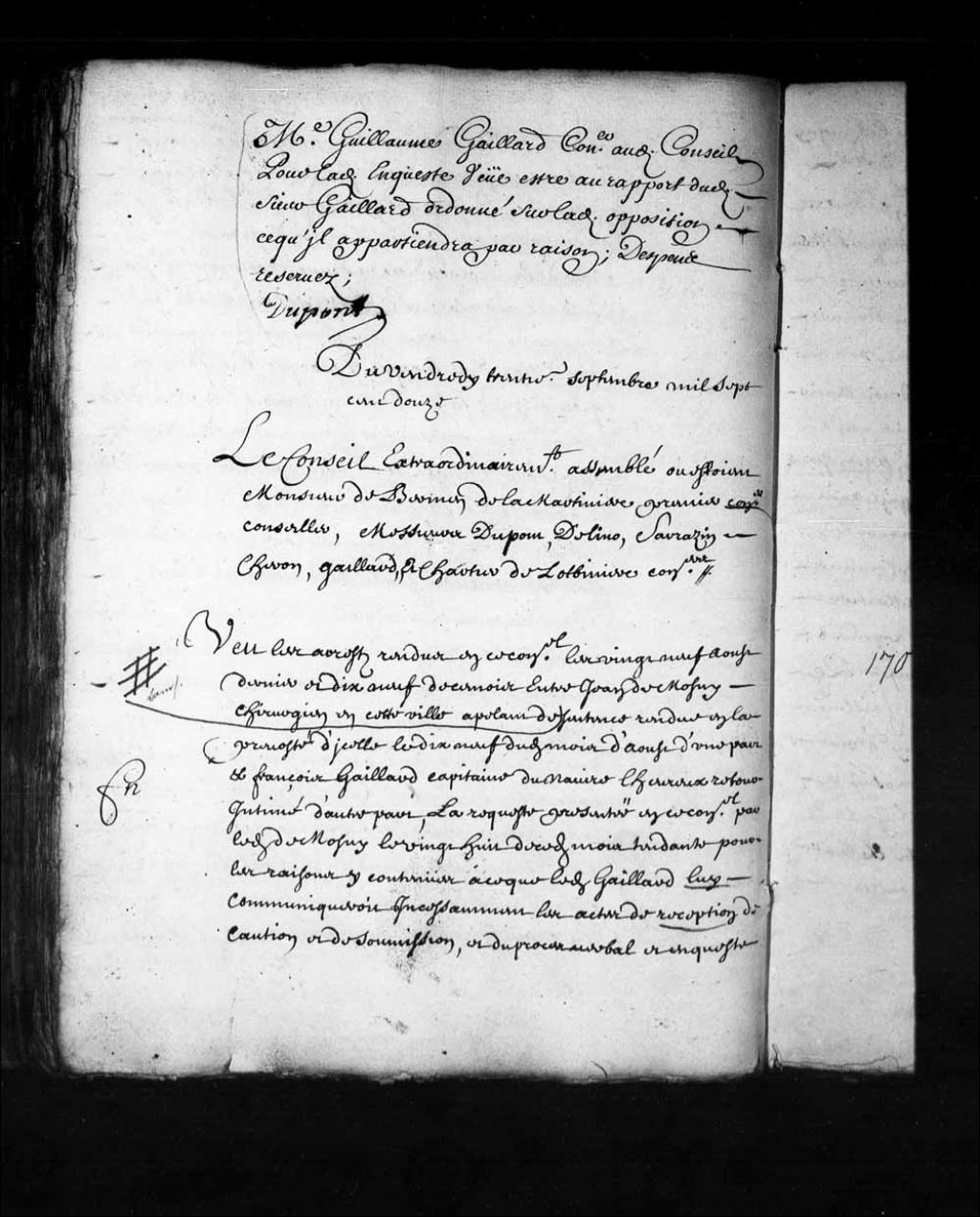 - Transcription du texte avec orthographe modernisée : «Du vendredi trentième septembre mille sept cent douze. Le Conseil extraordinairement assemblé où étaient Monsieur de Bermen de la Martinière premier conseiller, Messieurs Dupont, Delino (De Lino) Sarrazin, Cheron gaillard, et Chartier de Lotbinière conseillers. Vu les arrêts rendus en ce Conseil les vingt-neuf août dernier et dix-neuf de ce mois entre Jean de Mosny chirurgien en cette ville appelant de sentence rendue en la prévôté d'icelle le dix-neuf dudit mois d'août d'une part et François GAILLARD capitaine du navire L'Heureux Retour intimé d'autre part, la requête présentée en ce Conseil par ledit de Mosny le vingt-huit de ce dit mois tendante pour les raisons y contenues à ce que ledit Gaillard lui communiquerait incessamment les actes de réception de caution et de soumission, et du procès-verbal et enquête qu'il a faite pour l'instance être jugée incessamment l'ordonnance en [...]