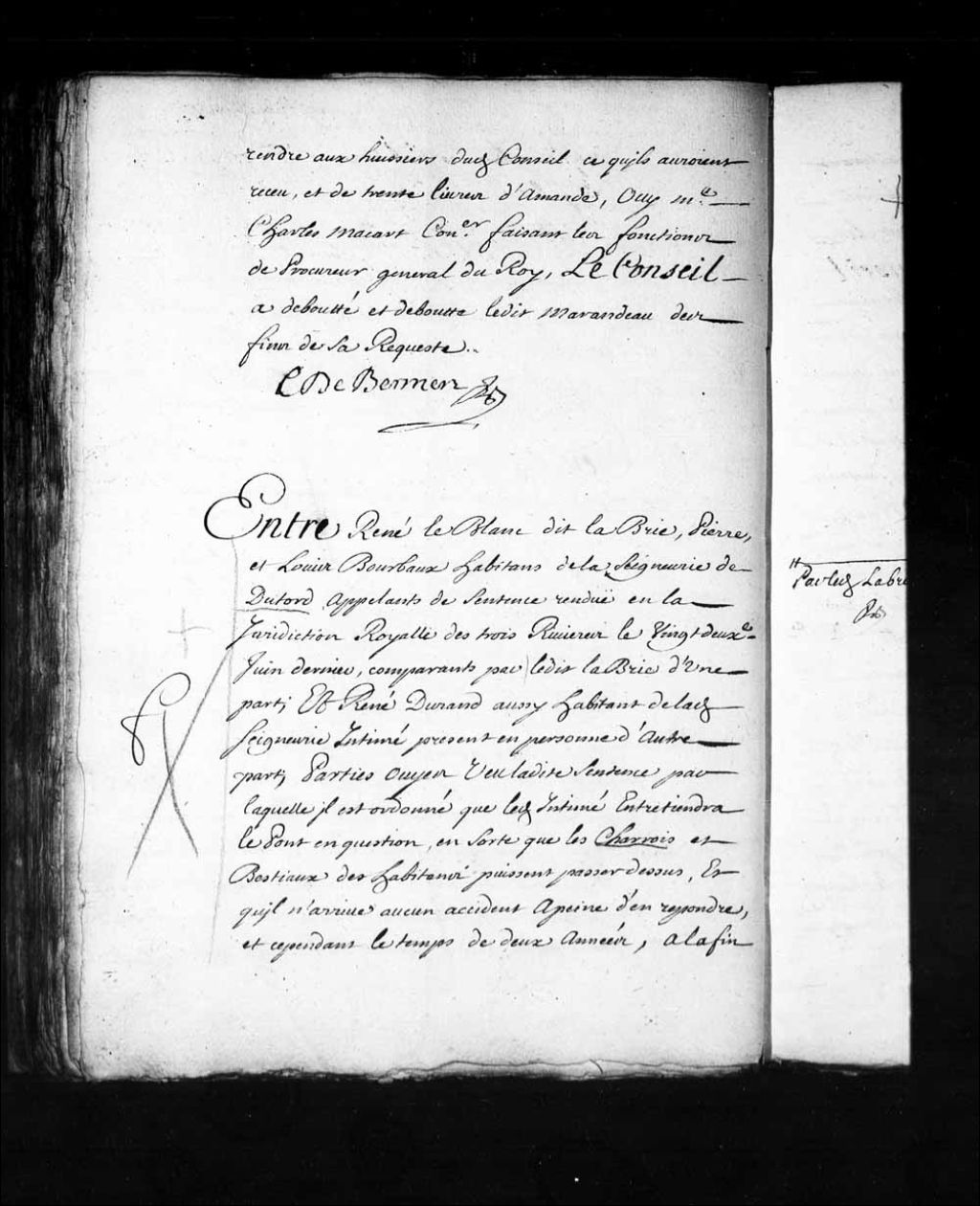 Transcription du texte avec orthographe modernisée : «Entre René LEBLANC dit LABRIE, Pierre, et Louis BOURBAUX (Bourbeau) habitants de la seigneurie de Dutord appelants de sentence rendue en la juridiction royale des Trois-Rivières le vingt-deuxième juin dernier, comparants par ledit LaBrie d'une part; et René DURAND aussi habitant de ladite seigneurie intimé présent en personne d'autre part. Parties ouïes vu ladite sentence par laquelle il est ordonné que ledit intimé entretiendra le pont en question, en sorte que les charrois et bestiaux des habitants puissent passer dessus, et qu'il n'arrive aucun accident à peine d'en répondre, et cependant le temps de deux années, à la fin desquelles tous les habitants de ladite seigneurie contribueront par des journées de leur travail, pour rendre ledit pont solide et hors de danger; requête présentée en ce Conseil par lesdits appelants aux fins d'être reçu appelants de ladite sentence; ordonnance [...]