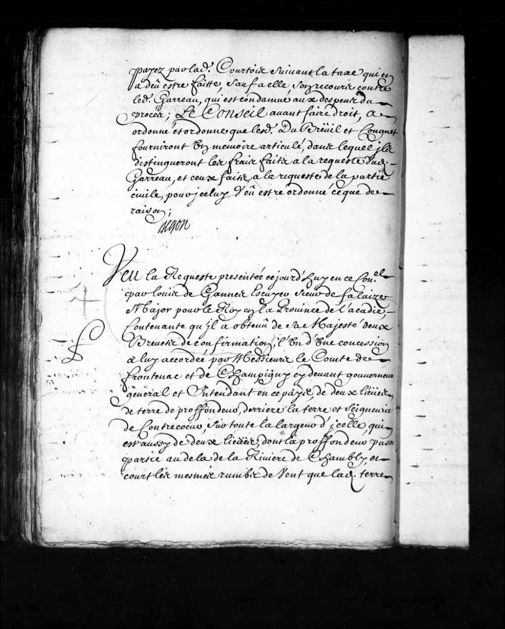 - Transcription du texte avec orthographe modernisée : «Vu la requête présentée ce jourd'hui en ce Conseil par Louis de Gannes écuyer sieur de Falaise major pour le Roi en la province de l'Acadie, contenante qu'il a obtenu de sa Majesté deux brevets de confirmation, l'un d'une concession à lui accordée par Messieurs le comte de Frontenac et de Champigny ci-devant gouverneur général et intendant en ce pays, de deux lieues de terre de profondeur, derrière la terre et seigneurie de Contrecoeur, sur toute la largeur d'icelle, qui est aussi de deux lieues, dont la profondeur passe partie au-delà de la Rivière de Chambly, et court les même rhumbs de vent que ladite terre de Contrecoeur avec les îles et îlets qui se trouvent dans ladite rivière de Chambly par le travers de la profondeur à titre de fief, haute, moyenne et basse justice, avec droit de chasse, pêche, et, traite avec les Sauvages, ledit brevet en date du vingt-deuxième mars 1695 signé Louis et plus bas, Phelypeaux; et l'autre de l'acquisition qu'il a fait de Jean Labat et Renée Gotrot sa femme d'une terre sise en ladite province de l'Acadie, au lieu appelé la petite rivière de la heue du côté du Ouest sud-ouest, à une pointe de bois brûlé; vis-à-vis l'île des Cannes; et d'autre côté à l'est nord-est ayant pour borne l'île Saint-Jean sur deux lieues de front et deux de profondeur; ensemble les îles et îlets qui sont au-devant de ladite terre; aussi à titre de fief et seigneurie, haute, moyenne et basse justice, avec droit de pêche et de chasse, ledit brevet en date du treizième mai mille sept cent quatre; aussi signé Louis et plus bas Phelypeaux; registré au greffe de l'Acadie le deuxième avril 1705. Requérant qu'il plaise à la Cour ordonner l'enregistrement en icelle desdits deux brevets pour par ledit sieur de Falaise, ses hoirs et ayant cause, jouir de l'effet et contenu en iceux et y avoir recours toutes fois et quantes que bon lui semblera; vu aussi les brevets ci-devant datés; ouï le procureur général du Roi; le Conseil a ordonné et ordonne que le brevet de ratification dudit jour vingt-deuxième mars mille six cent quatre-vingt-quinze, seulement, sera registré au greffe dudit Conseil, pour par ledit sieur de Faleise jouir du contenu en icelui. BEGON.»