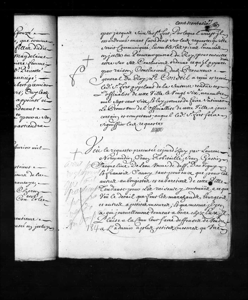 - Transcription du texte avec orthographe modernisée : «Vu la requête présentée ce jourd'hui par Laurent Normandin, Jean Robitaille, Jean Gastin (Gatin) Jacqueline Deleau (De L'Eau) veuve de défunt Daubigny (D'Aubigny) et François Janny (Janis) tant pour eux que pour les autres aubergistes et cabaretiers de cette ville tendante pour les raisons y contenues, à ce que vu le détail que font les marchands, bourgeois, et autres a petites mesures; et que même il y en à qui journellement donnent à boire chez eux; il plaise à la Cour leur faire défenses de vendre à l'avenir à plus petites mesures qu'une pinte d'eau-de-vie et un pot de vin conformément à l'arrêt rendu en ce Conseil le premier mars 1706 sous telle peine qu'il appartiendra que tous ceux qui voudront détailler, aient à mettre Bouchon, et que l'arrêt qui interviendra soit lu, publié et affiché, ou besoin sera, à ce qu'aucun n'en ignore; vu aussi l'arrêt dudit jour premier mars 1706. [...]