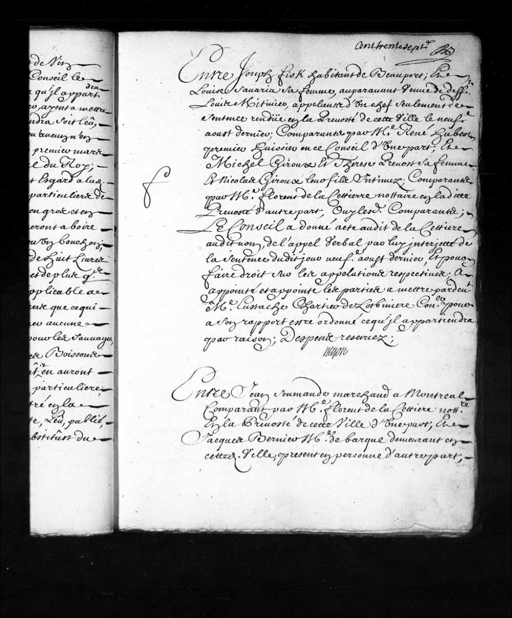 Acte donné à Florent de la Cettière (LaCetière), notaire en la Prévôté de Québec de l'appel verbal par lui interjeté de la sentence du 20 août dernier, dans la cause de Joseph Fisk, habitant de Beauport, et Louise Savaria, sa femme, auparavant veuve de feu Louis Métivier, appelants d'un chef de la sentence rendue le 9 août 1712, comparants par maître René Hubert, premier huissier en ce Conseil, contre Michel Giroux et Thérèse Provost, sa femme, et Nicolas Giroux, leur fils, comparants par ledit de la Cettière (LaCetière)