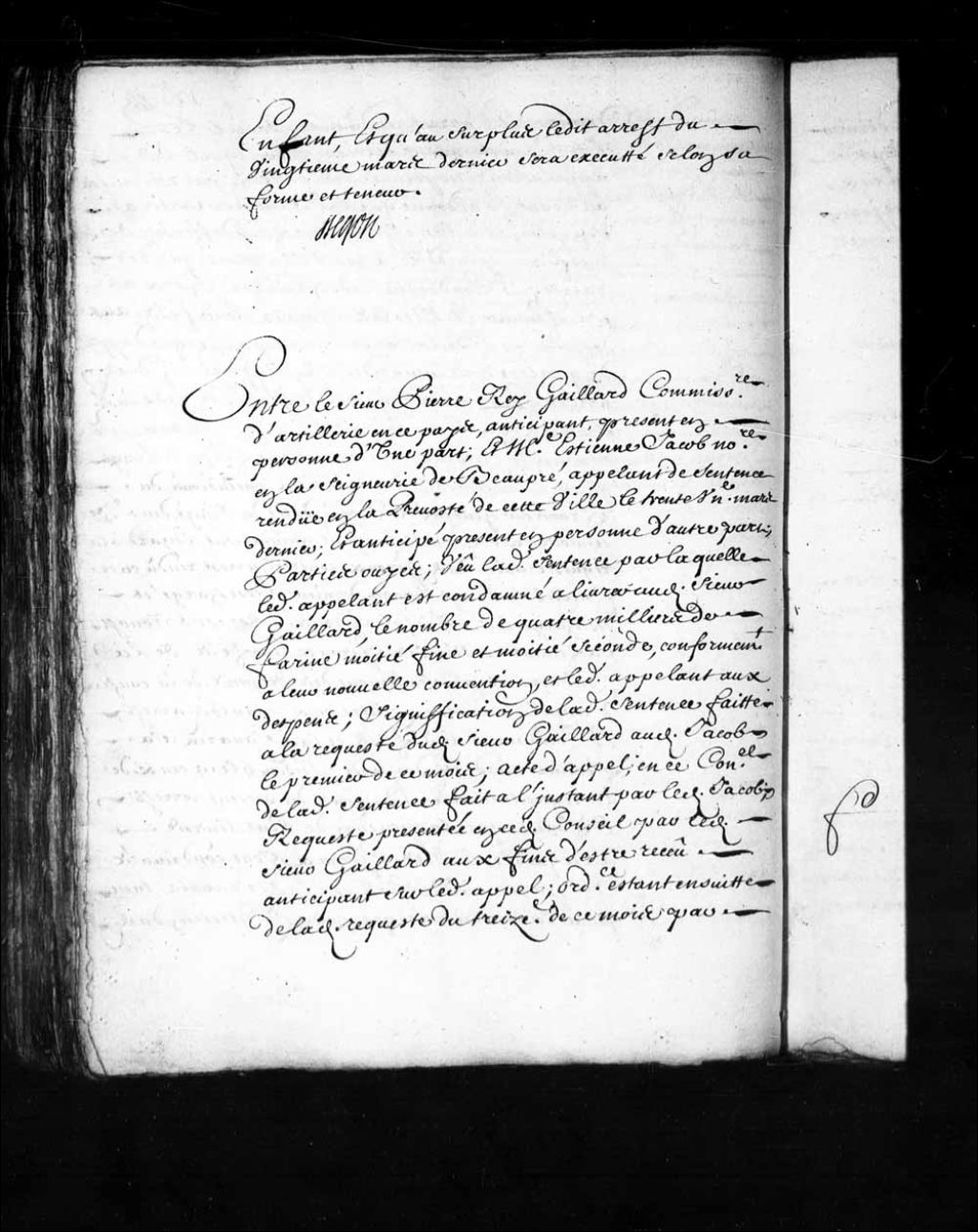 - Transcription du texte avec orthographe modernisée : «Entre le sieur Pierre REY GAILLARD commissaire d'artillerie en ce pays, anticipant, présent en personne d'une part; et maître Etienne JACOB notaire en la seigneurie de Beaupré, appelant de sentence rendue en la prévôté de cette ville le trente et unième mars dernier; et anticipé présent en personne d'autre part. Parties ouïes; vu ladite sentence par laquelle ledit appelant est condamné à livrer audit sieur Gaillard, le nombre de quatre milliers de farine moitié fine et moitié seconde, conformément à leur nouvelle convention, et ledit appelant aux dépens; signification de ladite sentence faite à la requête dudit sieur Gaillard audit Jacob le premier de ce mois; acte d'appel, en ce Conseil de ladite sentence fait à l'instant par ledit Jacob; requête présentée en ce dit Conseil par ledit sieur Gaillard aux fins d'être reçu anticipant sur ledit appel; ordonnance étant ensuite de ladite [...]