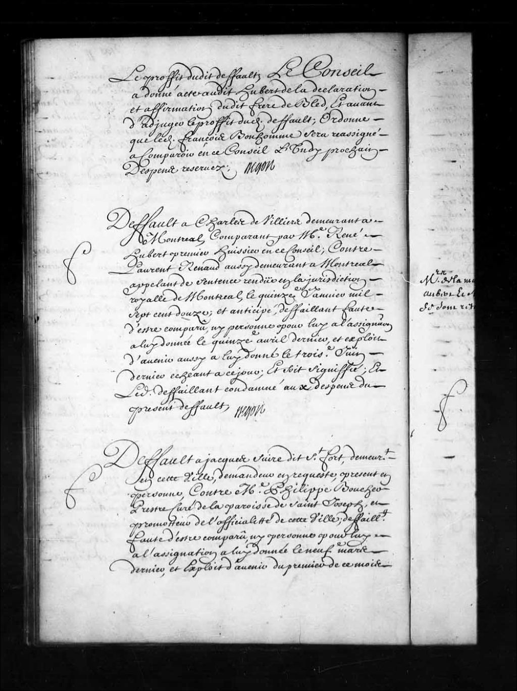 Transcription du texte avec orthographe modernisée : «Défaut à Jacques Suire dit Saint-Fort, demeurant en cette ville, demandeur en requête, présent en personne, contre messire Philippe Boucher prêtre curé de la paroisse de Saint-Joseph, et promoteur de l'officialité de cette ville; défaillant faute d'être comparu, ni personne pour lui à l'assignation à lui donnée le neuvième mars dernier, et exploit d'avenir du premier de ce mois échéant à ce jour, et soit signifié; et ledit défaillant condamné aux dépens du présent défaut. BEGON.»