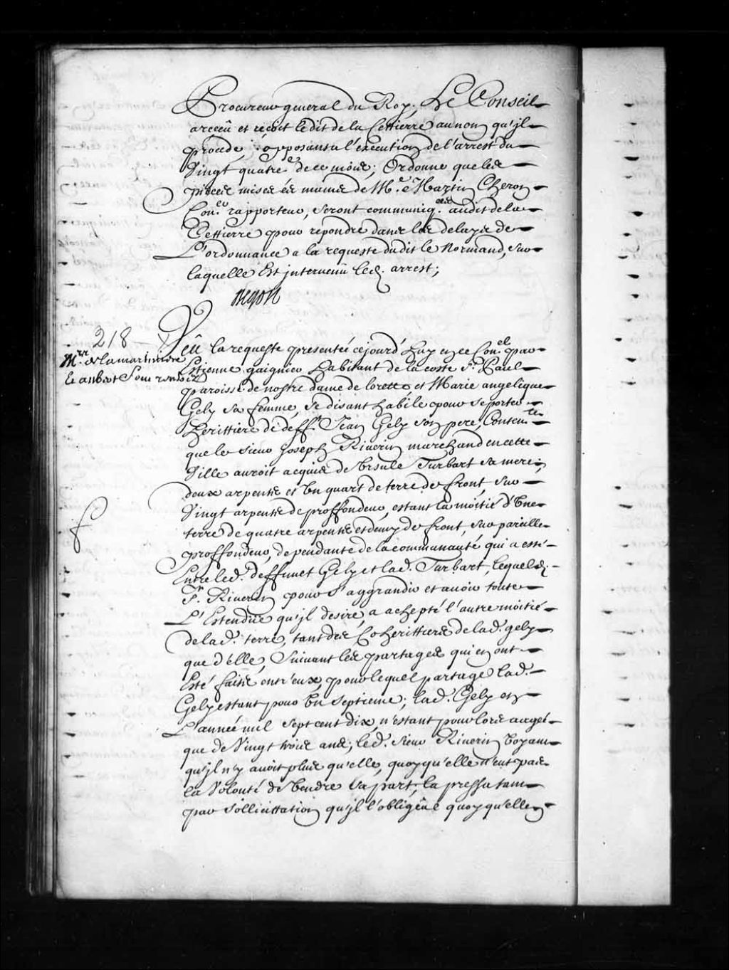 - Transcription du texte avec orthographe modernisée : «Messieurs de la Martinière et Aubert sont rentrés. Vu la requête présentée ce jourd'hui en ce Conseil par Etienne gaignier (Gagné) habitant de la côte Saint-Paul paroisse de Notre-Dame de Lorette, et Marie Angélique Gely sa femme, se disant habile pour se porter héritière de défunt Jean Gely son père, contenante que le sieur Joseph Riverin marchand en cette ville aurait acquis de Ursule Turbart (Turbal) sa mère; deux arpents et un quart de terre de front, sur vingt arpents de profondeur, étant la moitié d'une terre de quatre arpents et demi de front, sur pareille profondeur, dépendante de la communauté qui a été entre ledit défunt Gely et ladite Turbart, lequeldit sieur Riverin pour s'agrandir et avoir toute l'étendue qu'il désire, a acheté l'autre moitié de ladite terre, tant des cohéritiers de ladite gely que d'elle, suivant les partages qui en ont été faits entre eux, pour lequel [...]