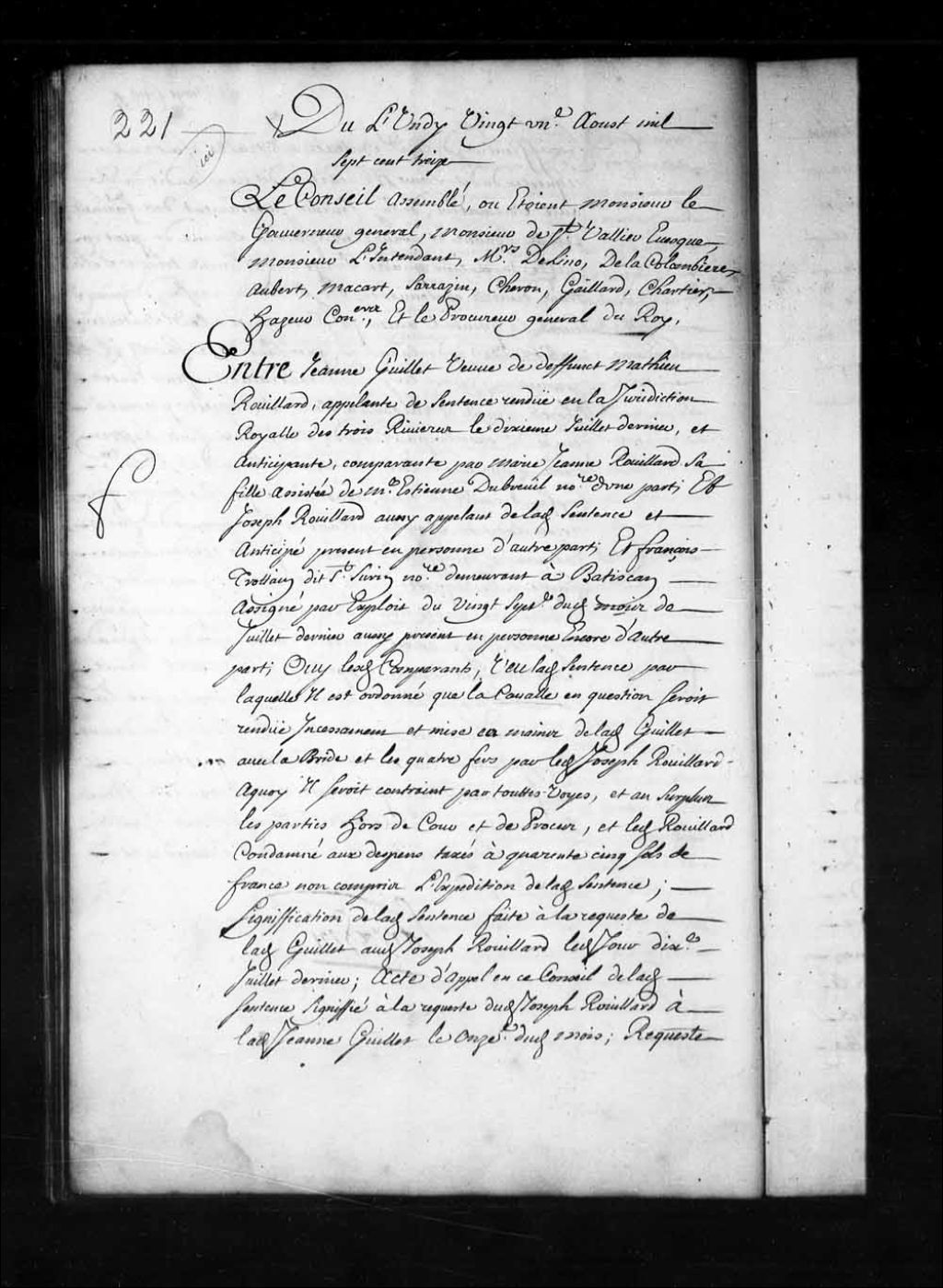 Transcription du texte avec orthographe modernisée : «Du lundi vingt et unième août mille sept cent treize. Le Conseil assemblé, où étaient Monsieur le gouverneur général, Monsieur de Saint-Vallier évêque, Monsieur l'intendant, Messieurs Delino (De Lino), de la Colombière, Aubert, Macart (Macard), Sarrazin, Cheron, Gaillard, Chartier, Hazeur conseillers, et le procureur général du Roi. Entre Jeanne GUILLET veuve de défunt Mathieu Rouillard, appelante de sentence rendue en la juridiction royale des Trois-Rivières le dixième juillet dernier, et anticipante, comparante par Marie Jeanne Rouillard sa fille assistée de maître Etienne Dubreuil notaire d'une part; et Joseph ROUILLARD aussi appelant de ladite sentence et anticipé présent en personne d'autre part; et François TROTTAIN dit Saint-SURIN notaire demeurant à Batiscan assigné par exploit du vingt-septième dudit mois de juillet dernier aussi présent en personne encore d'autre part; ouï [...]