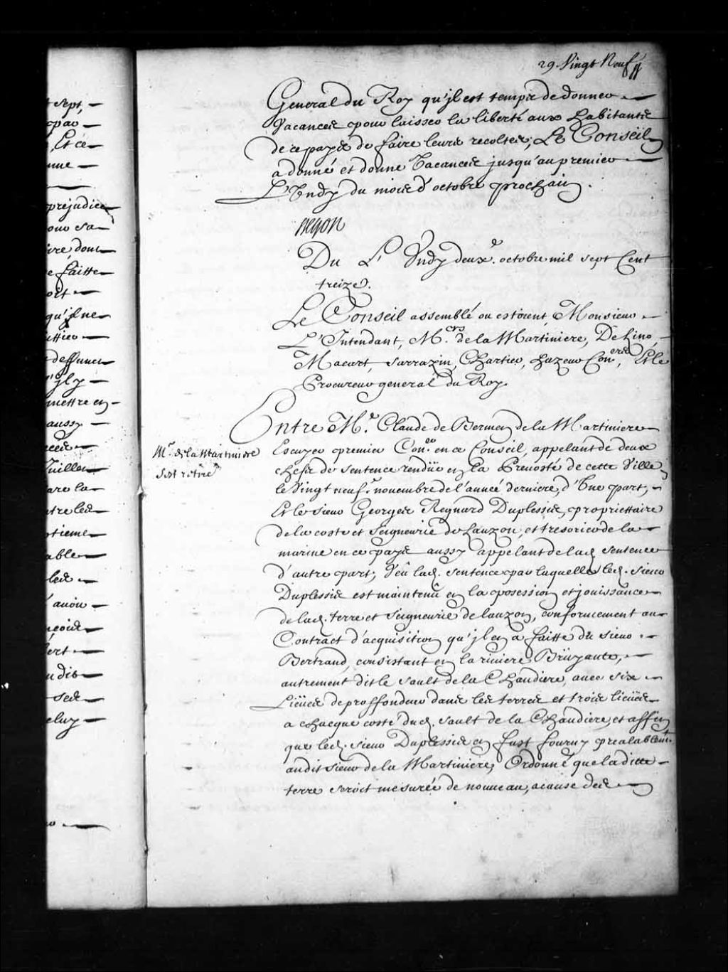- Transcription du texte avec orthographe modernisée : «Du lundi deuxième octobre mille sept cent treize. Le Conseil assemblé où étaient, Monsieur l'intendant, Messieurs de la Martinière, Delino (De Lino), Macart (Macard), Sarrazin, Chartier, Hazeur conseillers, et le procureur général du Roi. Monsieur de la Martinière s'est retiré. Entre maître Claude de BERMEN de LAMARTINIERE écuyer premier conseiller en ce Conseil, appelant de deux chefs de sentence rendue en la prévôté de cette ville le vingt-neuvième novembre de l'année dernière, d'une part; et le sieur Georges REGNARD DUPLESSIS, propriétaire de la côte et seigneurie de Lauson (Lauzon) et trésorier de la marine en ce pays aussi appelant de ladite sentence d'autre part; vu ladite sentence par laquelle ledit sieur Duplessis est maintenu en la possession et jouissance de ladite terre et seigneurie de Lauson, conformément au contrat d'acquisition qu'il en a faite du sieur Bertrand, [...]