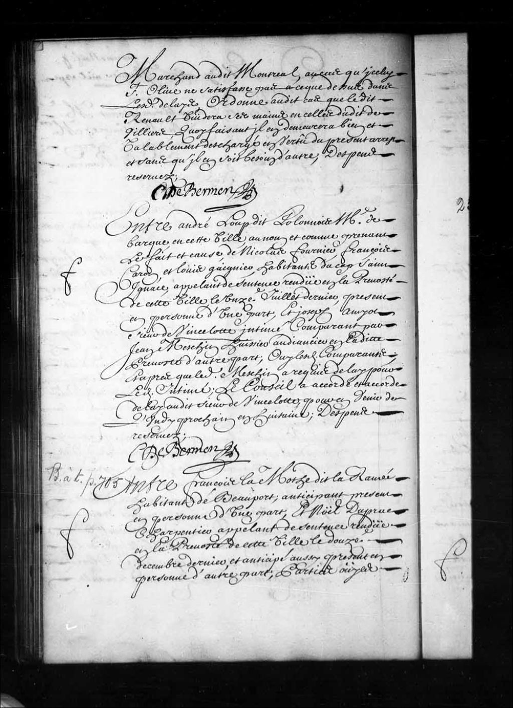 Transcription du texte avec orthographe modernisée : «Entre François LAMOTHE dit LARAMÉE habitant de Beauport, anticipant présent en personne d'une part; et Noël DUPRAC charpentier appelant de sentence rendue en la prévôté de cette ville le douzième décembre dernier, et anticipé aussi présent en personne d'autre part. Parties ouïes vu ladite sentence par laquelle ledit appelant est condamné à parachever la maison en question et la rendre faite et parfaite audit LaMothe dans le dixième mai prochain, et cependant de payer audit LaMothe la moitié de loyer de la maison ou il loge et sa famille, faute d'avoir parachevé ladite maison dans le temps convenu; et ledit appelant condamné aux dépens; signification de ladite sentence faite à la requête dudit LaMothe, audit appelant le seizième dudit mois de décembre, acte d'appel en ce Conseil de ladite sentence, fait à l'instant par ledit Duprac; requête présentée en ce Conseil par ledit LaMothe aux fins d'être reçu anticipant sur ledit appel; ordonnance étant ensuite du trentième du même mois par laquelle ledit LaMothe est reçu anticipant, et à lui permis de faire intimer à jour certain et compétent; signification desdites requête et ordonnance faite le même jour à la requête dudit LaMothe audit Duprac, avec assignation à comparaître ce jourd'hui en ce Conseil; le Conseil a mis et met l'appellation et ce dont est appel au néant; émendant condamne ledit Duprac à rendre la maison en question faite et parfaite, à la Sainte-Anne prochaine, tous dépens tant des causes principale que d'appel compensés. C. DE BERMEN»