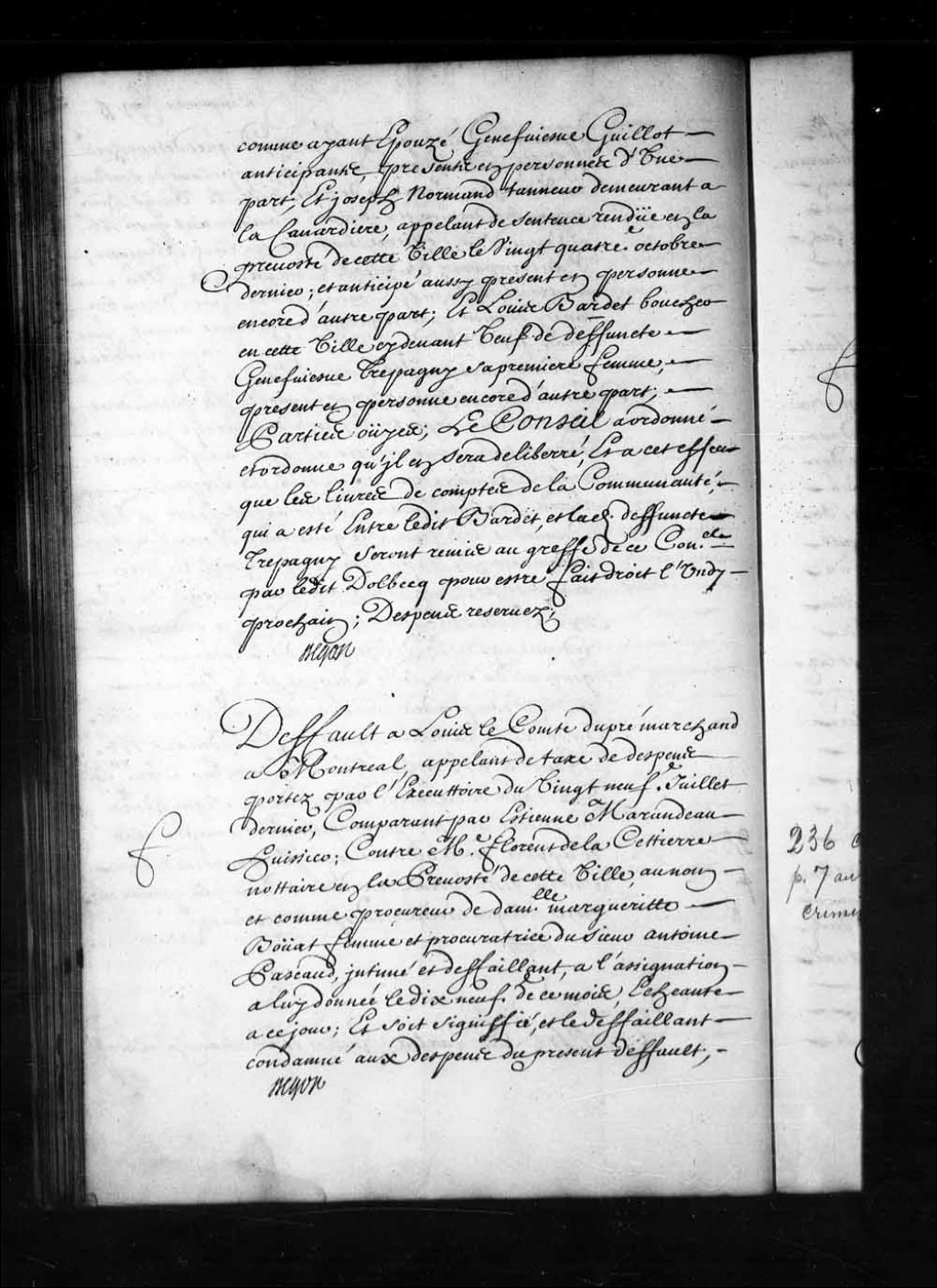 Défaut accordé à Louis Lecomte, sieur Dupré, marchand de Montréal, contre maître Florent de la Cettière (LaCetière), notaire de la Prévôté de Québec, en son nom et comme procureur de Marguerite Bouat, femme et procuratrice d'Antoine Pacaud, faute d'être comparu à l'assignation donnée le 19 janvier 1714