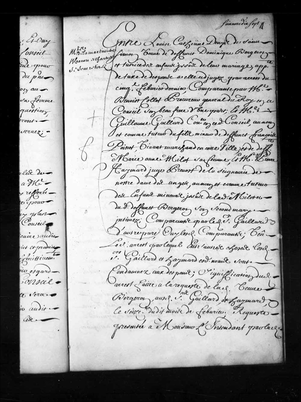 - Transcription du texte avec orthographe modernisée : «Messieurs de la Martinière Macart (Macard) et Chartier se sont retirés. Entre Louise Catherine Denis de Saint-Simon veuve de défunt Dominique Bergeron et tutrice des enfants issus de leur mariage, appelante de taxe de dépens à elle adjugés par arrêt du cinquième février dernier; comparante par maître Benoît Collet procureur général du Roi en ce Conseil son beau-frère d'une part; et maître Guillaume GAILLARD conseiller en ce dit Conseil, au nom et comme tuteur du fils mineur de défunt François Poisset, vivant marchand en cette ville, et de défunte Marie Anne Milot sa femme; et maître Pierre Haymard (Émard, Haimard) juge prévôt de la seigneurie de Notre-Dame-des-Anges, au nom et comme tuteur des enfants mineurs issus de ladite Milot et dudit défunt Bergeron son second mari intimés; comparants par ledit sieur Gaillard d'autre part; ouï lesdits comparants; vu ledit arrêt par lequel entre [...]