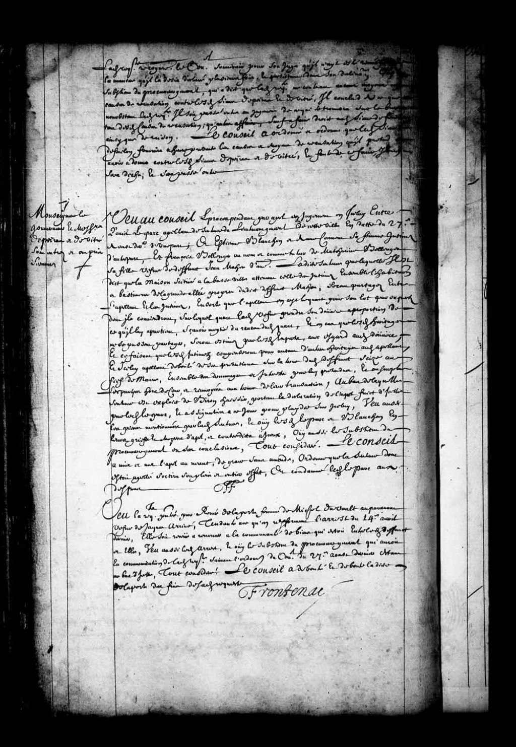 Transcription du texte avec orthographe modernisée : «Vu la requête présentée par Renée de Laporte femme de Michel Duvaut auparavant veuve de Jacques arrivé, tendante à ce qu'en reformant l'arrêt du 14e avril dernier, elle soit reçue à renoncer à la communauté de biens qui était entre ledit défunt et elle; vu aussi ledit arrêt, et ouï le substitut du procureur général qui aurait eu communication de ladite requête, suivant l'ordonnance du Conseil du 27e août dernier étant au bas d'icelle, tout considéré, le Conseil a débouté et déboute ladite de Laporte des fins de sa dite requête. FRONTENAC.»