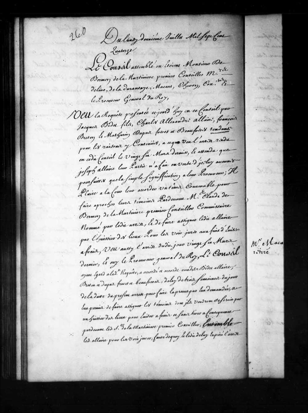 - Transcription du texte avec orthographe modernisée : «Du lundi deuxième juillet mille sept cent quatorze. Le Conseil assemblé où étaient Monsieur de Bermen de la Martinière premier conseiller Messieurs Delino (De Lino), de Ladurantaye, Macart (Macard), Cheron, conseillers et le procureur général du Roi. Vu la requête présentée ce jourd'hui en ce Conseil par Jacques Bidet fils, Charles Alexandre allaire, François Breton et Mathurin Dupas frères, et beau-frères tendante pour les raisons y contenues, à ce que vu l'arrêt rendu en ce dit Conseil le vingt-six mars dernier, et attendu que Joseph allaire leur Partie n'a fait en vertu d'icelui aucunes poursuites que la simple signification à leur procureur; il plaise à la Cour leur accorder un temps convenable pour faire approcher leurs témoins par-devant maître Claude de Bermen de la Martinière premier conseiller commissaire nommé par ledit arrêt, et de faire assigner ledit allaire par l [...]