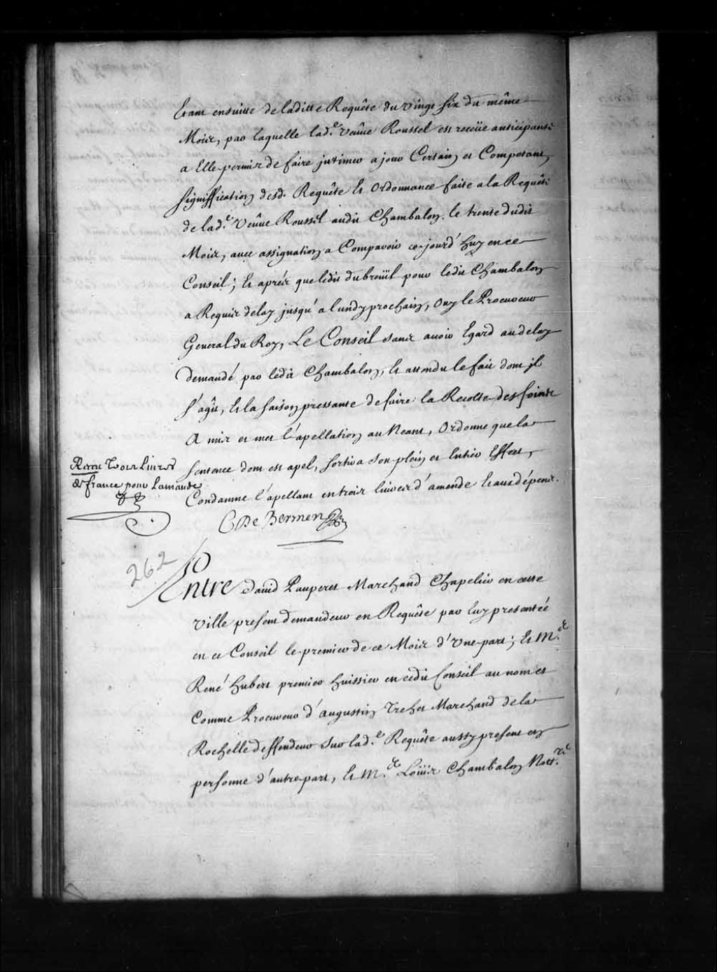 - Transcription du texte avec orthographe modernisée : «Entre David PAUPERET marchand chapelier en cette ville présent demandeur en requête par lui présentée en ce Conseil le premier de ce mois d'une part; et maître René HUBERT premier huissier en ce dit Conseil au nom et comme procureur de Augustin Trehet marchand de La Rochelle défendeur sur ladite requête aussi présent en personne d'autre part, et maître Louis CHAMBALON notaire en la prévôté de cette ville intervenant et demandeur en requête par lui présentée ce jourd'hui en ce Conseil comparant par maître Etienne Dubreuil aussi notaire en ladite prévôté encore d'autre part; ouï lesdits comparants, vu la requête dudit Pauperet tendante pour les raisons y contenues, à ce que la saisie, exécution, et enlèvement des meubles dudit Pauperet faite à la requête dudit Hubert par de Larivière huissier le trente juin dernier, en conséquence d'exécutoire décerné en ce Conseil le deuxième dudit mois de juin, soient déclarés nuls, injurieux, tortionnaires et déraisonnables, étant faits contre la disposition formelle de l'ordonnance, ce faisant faire pleine et entière mainlevée audit Pauperet des meubles sur lui saisis et exécutés, et ordonner, que ledit Hubert et ledit Larivière seront contraints par toutes voies dues et raisonnables même par corps, comme aussi condamner ledit Hubert en son propre et privé nom aux dommages et intérêts dudit Pauperet soufferts et à souffrir et aux dépens, et ledit Larivière en cents livres d'amende et interdiction de sa charge, et aussi condamner ledit Hubert d'exécuter la convention qu'il a faite avec ledit Pauperet, comme il paraît au bas du billet dudit Trehet; et à lui donner quittance par laquelle il consente que icelui Pauperet, soit et demeure subrogé au lieu et place droits, actions, et hypothèques dudit Trehet, pour exercer ses droits pour son remboursement, sur les biens de la communauté de défunt Philippe Basquin et Marie Joly ci-devant sa veuve et à présent femme dudit Pauperet, ainsi qu'il avisera, sinon que l'arrêt qui interviendra, vaudra quittance et subrogation, offrant ledit Pauperet à cet effet de payer comptant audit Hubert, la somme de quatre-vingt-neuf livres un sol monnaie de France qu'il doit de reste audit Trehet, en faisant par ledit Hubert vider la saisie que ledit Chambalon a fait faire en les mains dudit Pauperet sur ledit Trehet ordonnance étant ensuite de ladite requête dudit jour premier de ce mois, signification desdites requête et ordonnance faite audit Hubert le deuxième de ce dit mois, avec assignation en ce Conseil; arrêt rendu ledit jour deuxième de ce mois, portant que les parties en viendraient ce jourd'hui en ce Conseil, et cependant permis audit Hubert de lever la sentence rendue entre ledit Pauperet et ledit Chambalon le quatre octobre mille sept cent douze, signification dudit arrêt faite audit Hubert le quatre de ce dit mois avec assignation à ce jour, vu aussi ladite sentence, l'exécutoire, ladite saisie et exécution ci-devant datés, ensemble l'exploit de saisie faite à la requête dudit Chambalon en les mains dudit Pauperet le vingt-deux septembre de ladite année mille sept cent douze, requête présentée ce jourd'hui en ce Conseil par ledit Chambalon, tendante entre autres choses à être reçu appelant de la sentence dudit jour quatrième octobre mille sept cent douze et intervenant en la présente instance, le Conseil ayant aucunement égard à la requête dudit Pauperet, a déclaré et déclare la saisie et exécution sur lui faite nulle et injurieuse, et lui en fait pleine et entière mainlevée; ordonne néanmoins qu'il consignera au greffe dudit Conseil la somme de quatre-vingt-neuf livres un sol quatre deniers de France qu'il devait payer pour solde audit Hubert; et pour faire droit sur ladite requête, ensemble sur l'intervention demandée par la requête dudit Chambalon, ordonne que les parties en viendront à lundi prochain, et attendu les nullités qui se trouvent dans ladite saisie et exécution, que ledit Larivière huissier qui la faite viendra ledit jour de lundi prochain pour en rendre compte au Conseil, dépens réservés. C. DE BERMEN»