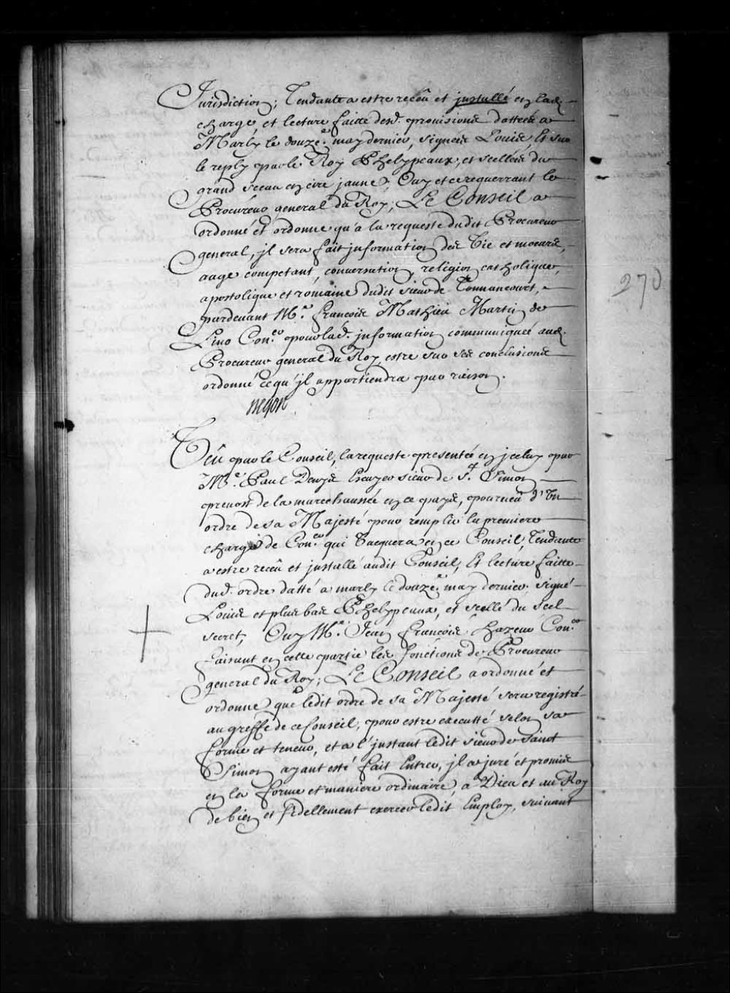 - Transcription du texte avec orthographe modernisée : «Vu par le Conseil, la requête présentée en icelui par maître Paul Denys (Denis) écuyer sieur de Saint-Simon prévôt de la maréchaussée en ce pays, pourvu d'un ordre de sa Majesté pour remplir la première charge de conseiller qui vaquera en ce Conseil, tendante à être reçu et installé audit Conseil, et lecture faite dudit ordre daté à Marly le douzième mai dernier; signé Louis et plus bas Phelypeaux, et scellé du scel secret, ouï maître Jean François Hazeur conseiller faisant en cette partie les fonctions de procureur général du Roi; le Conseil a ordonné et ordonne que ledit ordre de sa Majesté sera registré au greffe de ce Conseil; pour être exécuté selon sa forme et teneur, et à l'instant ledit sieur de Saint-Simon ayant été fait entrer il a juré et promis en la forme et manière ordinaire, à Dieu et au Roi de bien et fidèlement exercer ledit emploi, suivant et conformément aux lois [...]