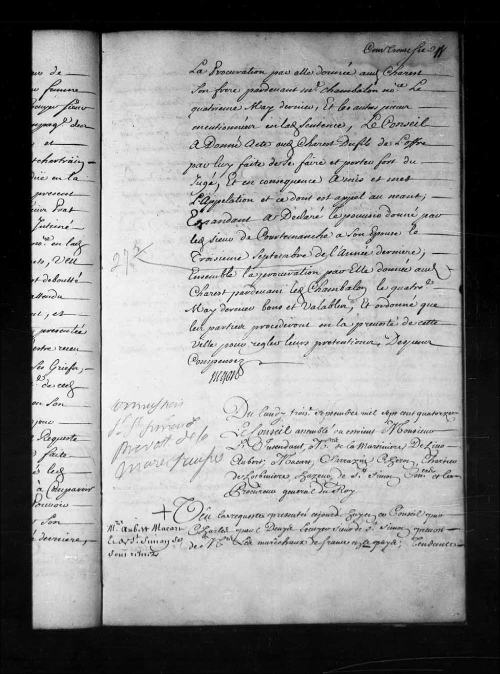Transcription du texte avec orthographe modernisée : «Du lundi troisième septembre mille sept cent quatorze. Le Conseil assemblé où étaient Monsieur l'intendant, Messieurs de la Martinière, Delino (De Lino), Aubert; Macart (Macard); Sarrazin, Cheron, Chartier de Lotbinière, Hazeur, de Saint-Simon conseillers et le procureur général du Roi. Messieurs Aubert Macart (Macard) et de Saint-Simon se sont retirés. Vu la requête présentée ce jourd'hui en ce Conseil par Charles Paul Denys (Denis) écuyer sieur de Saint-Simon prévôt de Messieurs les maréchaux de France en ce pays; tendante à qu'il plaise à la Cour ordonner que les lettres de provisions de ladite charge de prévôt de la maréchaussée en ce pays, à lui accordées par sa Majesté datées à Marly le douzième mai dernier, signées Louis et sur le repli par le Roi Phelypeaux, et scellées du grand sceau en cire jaune, ensemble l'attache sur icelles de Monsieur le marquis de Vaudreuil gouverneur [...]
