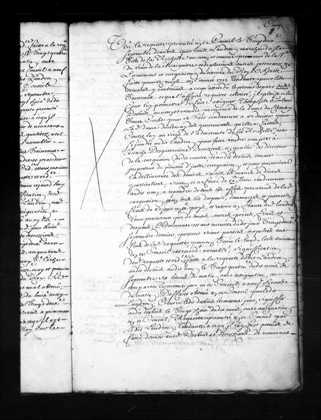 - Transcription du texte avec orthographe modernisée : «Vu la requête présentée en ce Conseil le vingt-deuxième septembre derniers par Louis Landron marchand en la ville de La Rochelle au nom et comme procureur de la veuve du sieur de La Maignière et de plusieurs autres intéressés en l'armement et cargaison du navire du Roi le Héros faite pour ce pays en l'année 1712 tendante pour les raisons y contenues, à ce qu'attendu le prompt départ des vaisseaux et que l'affaire requiert célérité; il plaise à la Cour lui permettre de faire assigner, Théophile Peclavé Desbois au nom et comme procureur de la dame Duclesnay veuve Coche pour se voir condamner à se désister pour ladite dame Duclesnay des poursuites qu'elle a faites; contre lui au siège de l'amirauté de La Rochelle, et à se joindre audit Landron, pour faire rendre compte à Eustache Desguerrouere (Desguerrois) Desrosiers en qualité de directeur de la cargaison dudit navire, et audit [...]