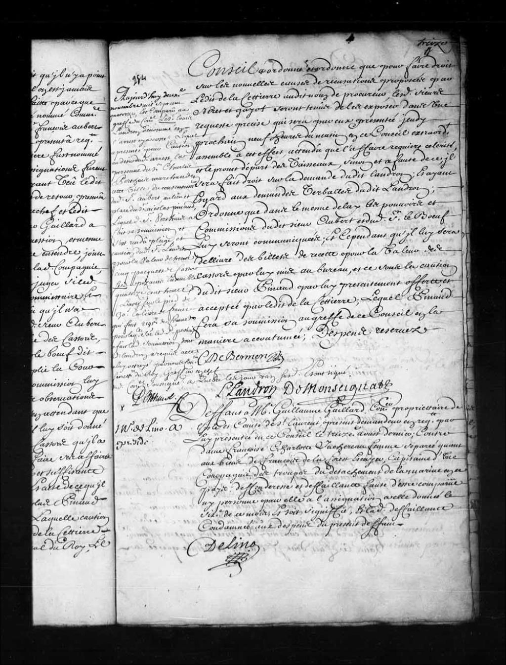 - Transcription du texte avec orthographe modernisée : «Aujourd'hui deuxième novembre mille sept cent quatorze, est comparu au greffe du Conseil le sieur Louis Landron dénommé en l'arrêt ci à côté; lequel a présenté pour caution au désir dudit arrêt, la personne du sieur Charles Perthuis marchand en cette ville, du consentement dudit sieur Aubert, au lieu et place du sieur Nicolas Pinaud (Pineau, Pinault), lequel sieur Perthuis a fait sa soumission et s'est rendu pleige et caution dudit sieur Landron (Landeron) pour la valeur de trente-cinq paquets de castors secs pesants ensemble quatorze cent trente livres sur le pied de 30 sols la livre de France qui font 2145 livres de France pour laque somme ledit sieur perthuis a fait ladite soumission dont ledit Landron a requis acte à lui octroyé par nous conseiller secrétaire du Roi, greffier en chef dudit Conseil soussigné; à Québec les jour et an susdits et ont signé. PERTHUIS L. LANDRON DE MONSEIGNAT»
