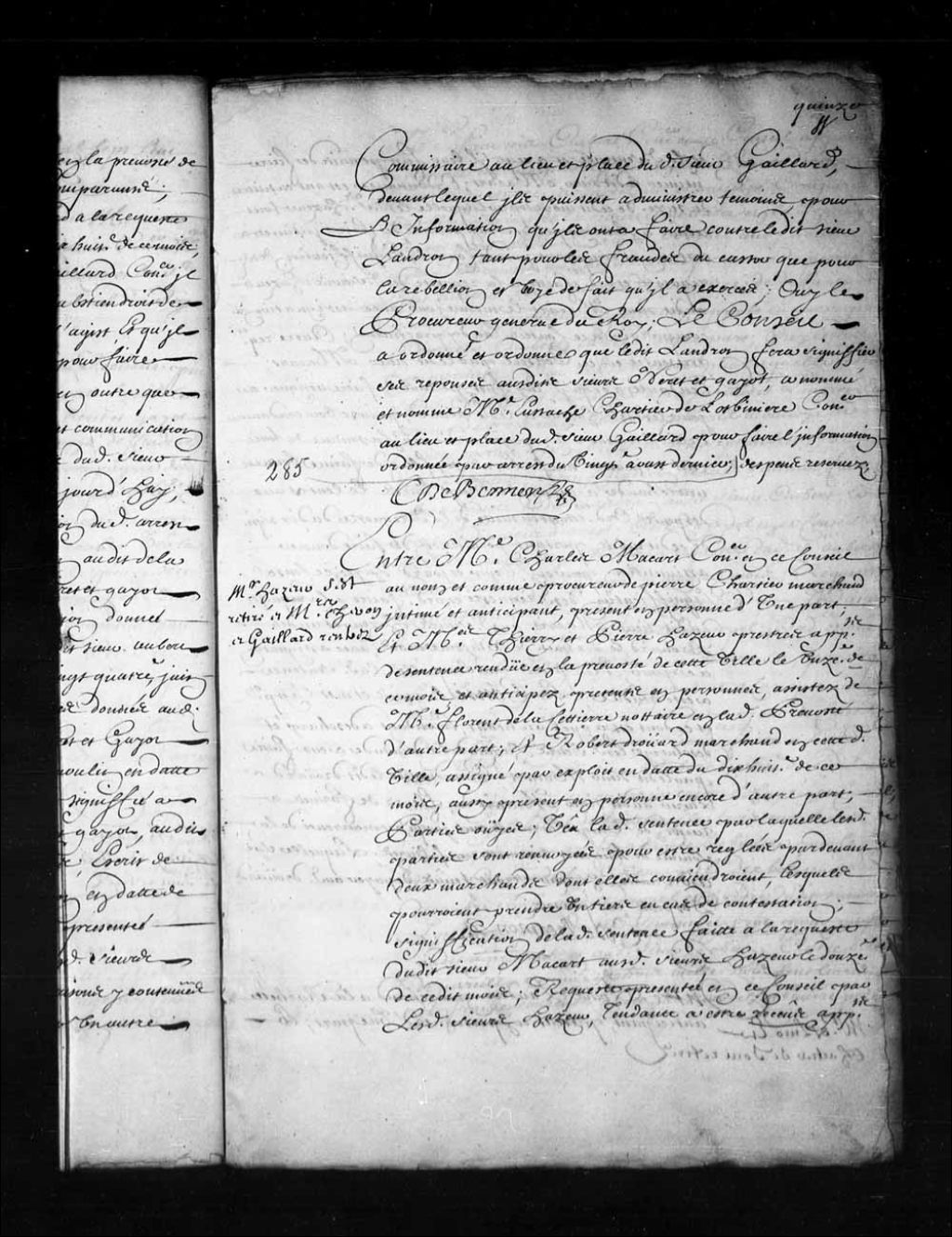 - Transcription du texte avec orthographe modernisée : «Monsieur Hazeur s'est retiré et Messieurs Cheron et Gaillard rentrés. Entre maître Charles Macart (Macard) conseiller en ce Conseil au nom et comme procureur de Pierre Chartier marchand intimé et anticipant, présent en personne d'une part; et maîtres Thierry et Pierre HAZEUR prêtres appelants de sentence rendue en la prévôté de cette ville le onzième de ce mois et anticipés présents en personnes, assistés de maître Florent de LaCettière (Lacetière) notaire en ladite prévôté d'autre part; et Robert DOUARD marchand en cette dite ville, assigné par exploit en date du dix-huitième de ce mois, aussi présent en personne encore d'autre part. Parties ouïes; vu ladite sentence par laquelle lesdites parties sont renvoyées pour être réglées par-devant deux marchands dont elles conviendraient, lesquels pourraient prendre un tiers en cas de contestation; signification de ladite sentence faite à la requête dudit sieur Macart (Macard) auxdits sieurs Hazeur le douzième de ce dit mois; requête présentée en ce Conseil par lesdits sieurs Hazeur, tendante à être reçus appelants de ladite sentence et à ce qu'il leur fut permis de faire intimer ledit sieur Macart (Macard); ordonnance étant ensuite du seizième de ce dit mois par laquelle lesdits sieurs Hazeur sont reçus en leur appel et à eux permis de faire intimer à certain et compétent jour de Conseil; signification desdites requête et ordonnance faite à la requête desdits sieurs Hazeur audit sieur Macart (Macard) le même jour avec assignation à comparaître en ce Conseil lundi prochain; autre requête présentée en ce Conseil par ledit sieur Macart (Macard); tendante à ce qu'il lui fut permis de faire assigner à ce jour lesdits sieurs Hazeur et ledit Drouard, pour se voir condamner solidairement à lui payer audit nom la somme de huit cent soixante-neuf livres en fleur de farine bonne et marchande, à raison de vingt livres le cent et aux dépens; ordonnance étant ensuite de ladite requête du dixième septième de ce dit mois, portant permission de faire donner assignation pour en venir ce jourd'hui en ce Conseil; signification desdites requête et ordonnance faite à la requête dudit sieur Macart (Macard) auxdits sieurs Hazeur et audit Drouard le dix-huitième de ce même mois, avec assignation à ce jour; et les pièces sur lesquelles ladite sentence a été rendue; le Conseil a mis et met l'appellation et ce dont est appel au néant, émendant a déchargé et décharge lesdits sieurs Hazeur de la demande à eux faite par ledit sieur Macart (Macard); condamne ledit Drouard à livrer audit sieur Macart (Macard) des fleurs de farines à raison de vingt livres le cent jusqu'à concurrence de la somme de huit cent soixante-neuf livres; laquelle somme lesdits sieurs Hazeur seront tenus de payer audit Drouard; dépens compensés. C. DE BERMEN»
