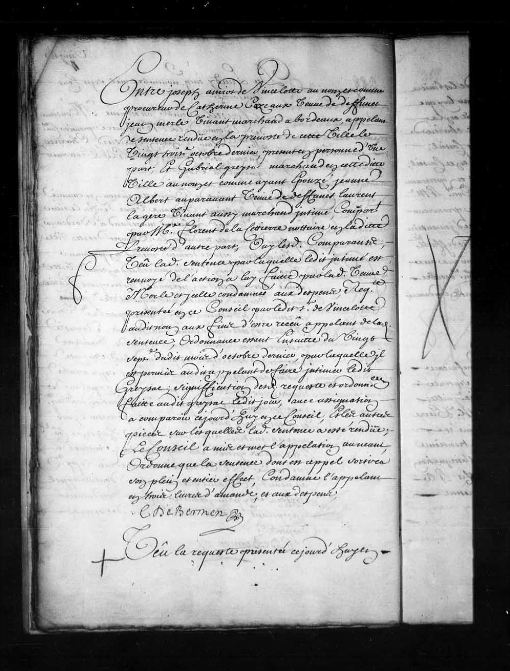 Transcription du texte avec orthographe modernisée : «Entre Joseph AMIOT de VINCELOTTE au nom et comme procureur de Catherine Cazeaux veuve de défunt Jean merle vivant marchand à Bordeaux, appelant de sentence rendue en la prévôté de cette ville le vingt-troisième octobre dernier, présent en personne d'une part; et Gabriel GREYSAC marchand en cette dite ville au nom et comme ayant épousé Jeanne Albert auparavant veuve de défunt Laurent Lagere, vivant aussi marchand intimé, comparant par maître Florent de Lacettierre (Lacetière) notaire en ladite prévôté d'autre part; ouï lesdits comparants; vu ladite sentence par laquelle ledit intimé est renvoyé de l'action à lui faite par ladite veuve Merle et icelle condamnée aux dépens; requête présentée en ce Conseil par ledit sieur de Vincelotte audit nom aux fins d'être reçu appelant de ladite sentence; ordonnance étant ensuite du vingt-septième dudit mois d'octobre dernier, par laquelle il est permis audit appelant de faire intimer ledit Greysac; signification desdites requête et ordonnance faite audit greysac ledit jour; avec assignation à comparaître ce jourd'hui en ce Conseil, et les autres pièces sur lesquelles ladite sentence a été rendue; le Conseil a mis et met l'appellation au néant, ordonne que la sentence dont est appel sortira son plein et entier effet, condamne l'appelant en trois livres d'amende, et aux dépens; C. DE BERMEN»