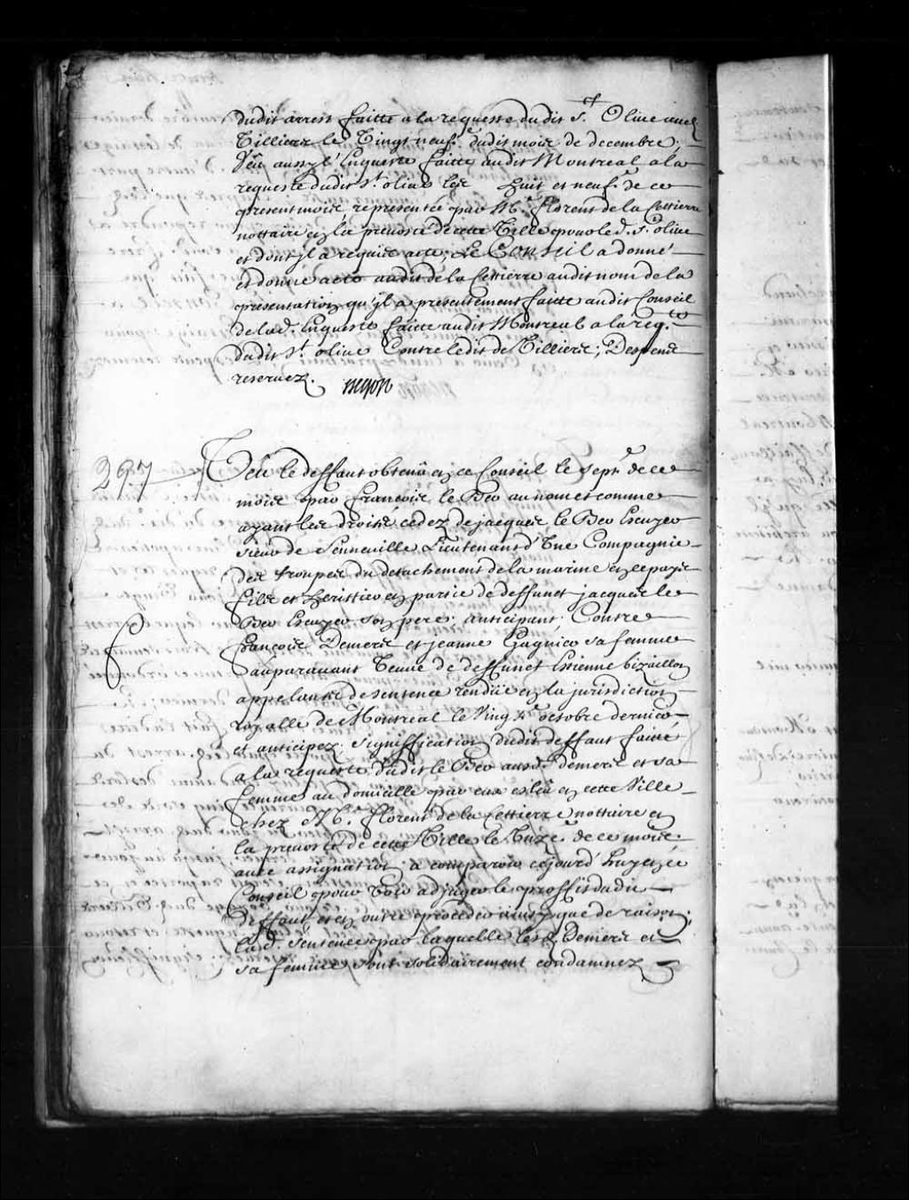 - Transcription du texte avec orthographe modernisée : «Vu le défaut obtenu en ce Conseil le septième de ce mois par François LeBer au nom et comme ayant les droits cédés de Jacques LeBer écuyer sieur de Senneville lieutenant d'une compagnie des troupes du détachement de la marine en ce pays fils et héritier en partie de défunt Jacques LeBer écuyer son père; anticipant; contre François Demers et Jeanne Gagnier (Gagné) sa femme auparavant veuve de défunt Etienne Bizaillon (Bisaillon) appelants de sentence rendue en la juridiction royale de Montréal le vingtième octobre dernier, et anticipés; signification dudit défaut faite à la requête dudit LeBer auxdits Demers et sa femme au domicile par eux élu en cette ville chez maître Florent de Lacettierre (Lacetière) notaire en la prévôté de cette ville le onzième de ce mois; avec assignation à comparaître ce jourd'hui en ce Conseil pour voir adjuger le profit dudit défaut, et en outre procéder [...]