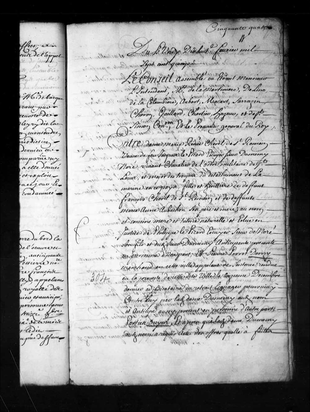 Transcription du texte avec orthographe modernisée : «Du lundi dix-huitième février mille sept cent quinze. Le Conseil assemblé où étaient Monsieur l'intendant, Messieurs de la Martinière, Delino (De Lino), de la Colombière, Aubert, Macart (Macard), Sarrazin, Cheron, Gaillard, Chartier, Hazeur, et de Saint-Simon conseillers, et le procureur général du Roi. Entre dame Marie Renée CHOREL de Saint-Romain veuve de feu Jacques le Picard (Lepicard) écuyer sieur Dumesny Noré, vivant chevalier de l'ordre militaire de Saint-Louis, et major des troupes du détachement de la marine en ce pays, fille et héritière de défunt François Chorel de Saint-Romain et de défunte Marie Anne Aubuchon ses père et mère, au nom et comme mère et tutrice naturelle et élue en justice de Philippe le Picard écuyer sieur de Noré son fils et dudit sieur Dumesny anticipante présente en personne d'une part; et Pierre PERROT (Perrault) DERISY marchand en cette ville appelant [...]