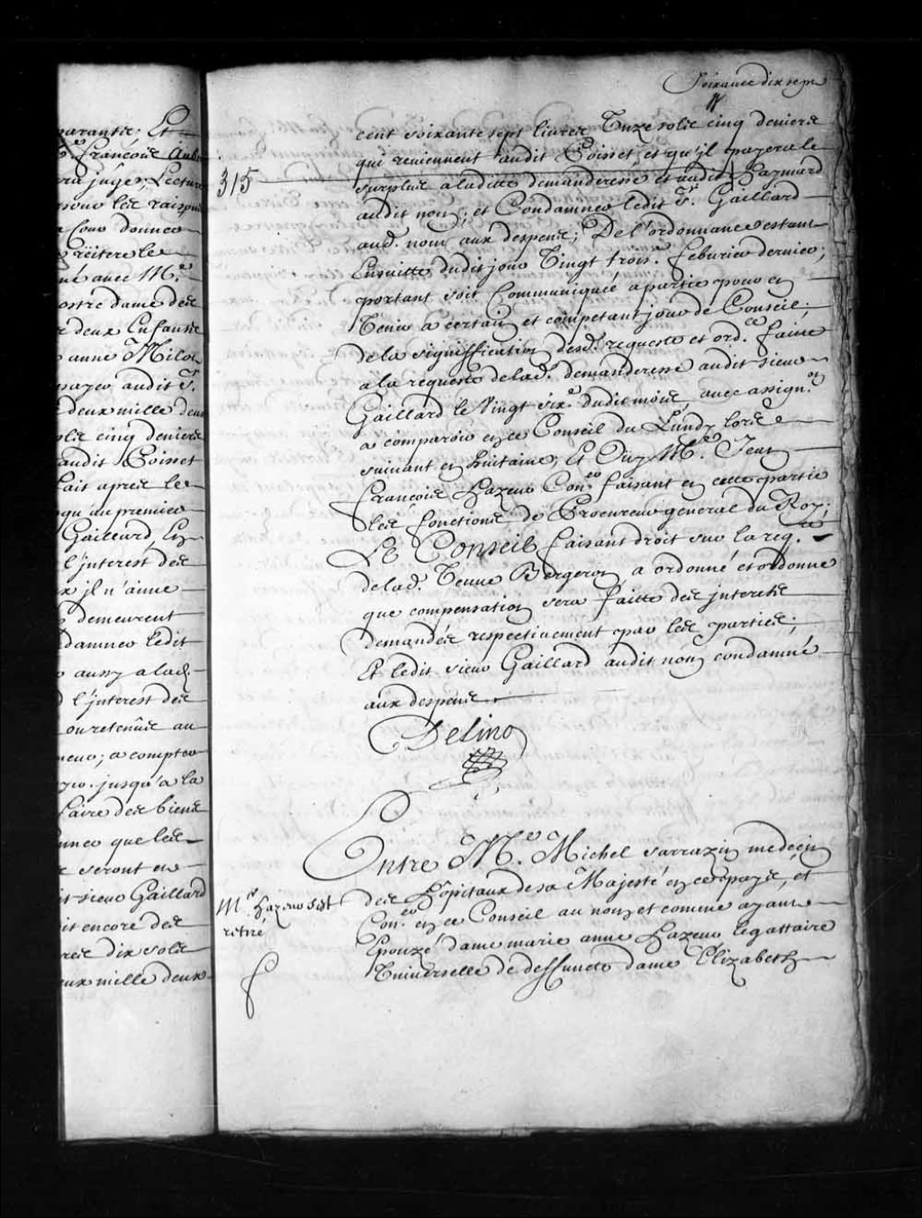 - Transcription du texte avec orthographe modernisée : «Monsieur Hazeur s'est retiré. Entre maître Michel SARRAZIN médecin des hôpitaux de sa Majesté en ce pays, et conseiller en ce Conseil au nom et comme ayant épousé dame Marie Anne Hazeur, légataire universelle de défunte dame Elisabeth Barbe au jour de son décès veuve de feu maître François Hazeur vivant conseiller en ce Conseil, anticipant et présent en personne assisté de maître Florent de cettierre notaire en la prévôté de cette ville d'une part; et messire Pierre GIRARD DU VORLAY prêtre chanoine de l'église cathédrale de cette ville au nom et comme procureur de maître René Boullay seigneur de Laroche Saint-Jean, conseiller et procureur du Roi aux eaux et forêts de la ville de Loches, syndic des pères capucins de ladite ville de Loches, légataires par forme d'aumône de ladite défunte dame Hazeur, appelant de sentence rendue en la prévôté de cette ville le neuvième novembre dernier, et anticipé aussi présent en personne d'autre part. Parties ouïes vu ladite sentence par laquelle ledit appelant est condamné audit nom à recevoir en cartes dudit sieur Sarrazin en ladite qualité la somme de trois cents livres monnaie de France léguée auxdits pères capucins de Loches par ladite défunte dame Hazeur; et à lui en donner quittance, et ledit appelant aux dépens, signification de ladite sentence faite à la requête dudit sieur Sarrazin audit sieur Girard le dix-neuvième de ce mois; acte d'appel en ce Conseil de ladite sentence fait à l'instant par ledit sieur Girard; requête présentée en ce Conseil par ledit sieur Sarrazin aux fins d'être reçu anticipant sur ledit appel; ordonnance étant ensuite dudit jour dix-neuvième de ce mois par laquelle ledit sieur Sarrazin est reçu anticipant, à lui permis de faire assigner à certain et compétent jour de Conseil; signification desdites requête et ordonnance faite à la requête dudit sieur Sarrazin audit sieur Girard le même jour; avec assignation à comparaître ce jourd'hui en ce Conseil, et les autres pièces sur lesquelles ladite sentence a été rendue; ouï le procureur général du Roi; le Conseil a mis et met l'appellation au néant; ordonne que la sentence dont est appel sortira son plein et entier effet; condamne l'appelant aux dépens, de grâce sans amende. Delino (De Lino) .»
