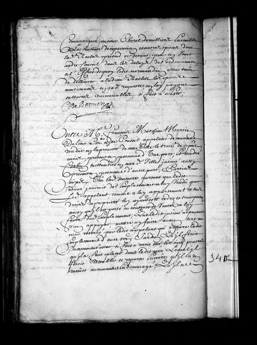 Transcription du texte avec orthographe modernisée : «Entre maître François Mathieu Martin Delino (De Lino) Coller en ce Conseil, appelant de sentence rendue en la prévôté de cette ville le troisième de ce présent mois, présent en personne d'une part; et André CORBIN taillandier en cette dite ville, intimé aussi présent en personne d'autre part. Parties ouïes; vu ladite sentence, portant que ledit intimé jouirait de l'emplacement à lui vendu par ledit appelant, comme à lui appartenant et tous droits de propriété lui ayant été cédés et transportés ainsi qu'il est porté au contrat de vente à lui faite dudit emplacement; que ledit intimé ne pourrait rien appuyer, mettre, ni faire aucun tort au mur réservé par ledit appelant qui sépare ledit emplacement d'avec son jardin; qu'il ferait incessamment ôter, si fait n'avait été, les cinq poutres qu'il a fait placer dans ledit mur; lequel il ferait rétablir et réparer en sorte qu'il n'en restât aucunement endommagé; qu'il ne pourrait faire aucuns appentis, arrangements de bois de corde, ou autrement qu'il ne laissât six pieds dudit mur, au-dessus de ce qu'il y pourrait faire ou mettre contre, sans cependant qu'il y pût faire aucun arrangement; qu'il entretiendrait en bon et dû état la dalle qu'il a mise au bas de la couverture, de l'appentis qu'il a fait bâtir sur ledit emplacement, et le revers qui est contre ledit mur, en sorte que les eaux dudit appentis les neiges, ni les glaces ne le pussent endommager; et qu'il ferait exaucer la cheminée de sa forge, en sorte qu'elle ne menaçâ aucunement du feu; et icelui intimé condamné au quart des dépens; requête présentée en ce Conseil par ledit sieur Delino (De Lino), aux fins d'être reçu appelant de ladite sentence; ordonnance étant ensuite du dix-neuvième de ce dit mois, par laquelle il est reçu appelant, à lui permis d'intimer à jour certain et compétent; signification desdites requête et ordonnance ensemble de ladite sentence faite à la requête dudit appelant audit intimé le vingtième de ce même mois; avec assignation à comparaître ce jourd'hui en ce Conseil, et les autres pièces sur lesquelles ladite sentence a été rendue; tout considéré; le Conseil a mis et met l'appellation et ce dont est appel au néant; en ce que l'intimé est seulement condamné à entretenir la dalle de l'appentis en question en bon état, et en ce qu'il n'a été condamné qu'en un quart de dépens; émendant quant a ce, condamne ledit intimé à faire construire ledit appentis, conformément à son contrat, et de manière due l'égout des eaux, ne tombe point sur le mur de l'appelant; comme aussi de laisser les six pieds d'exhaussement mentionnés audit contrat, et du bas jusqu'au haut desdits six pieds, laisser encore six pieds de distance pour les vues que l'appelant s'est réservé; et en outre ledit intimé condamné aux dépens des causes principale et d'appel, à taxer par maître François Aubert conseiller; ordonne qu'au résidu ladite sentence sera exécutée selon sa forme et teneur. C. DE BERMEN»