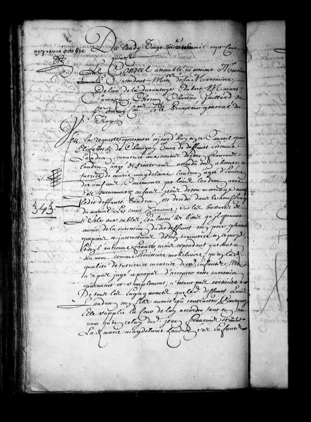 Transcription du texte avec orthographe modernisée : «Du lundi vingt et unième octobre mille sept cent quinze. Approuve octobre C. B. Le Conseil assemblé où étaient Monsieur l'intendant; Messieurs de la Martinière, Delino (De Lino), de Ladurantaye, Aubert, Macart (Macard), Sarrazin, Cheron, Chartier, Gaillard, de Saint-Simon conseillers et le procureur général du Roi. Vu la requête présentée ce jourd'hui en ce Conseil par Elisabeth de Chavigny veuve de défunt Etienne Landron; curatrice aux causes de Jean François Landron âgé de trente ans attendu son absence, et tutrice de Marie Madeleine Landron âgée d'environ dix-neuf ans; contenante que Louis Landron avec les sus-nommés enfants issus de son mariage avec ledit défunt Landron, est décédé dans le naufrage du navire le Saint-Jérôme (Saint-Hiérosme), sur les battures de l'île aux sables; et a laissé les biens qu'il pouvait avoir de la succession dudit défunt son père; plusieurs papiers et [...]