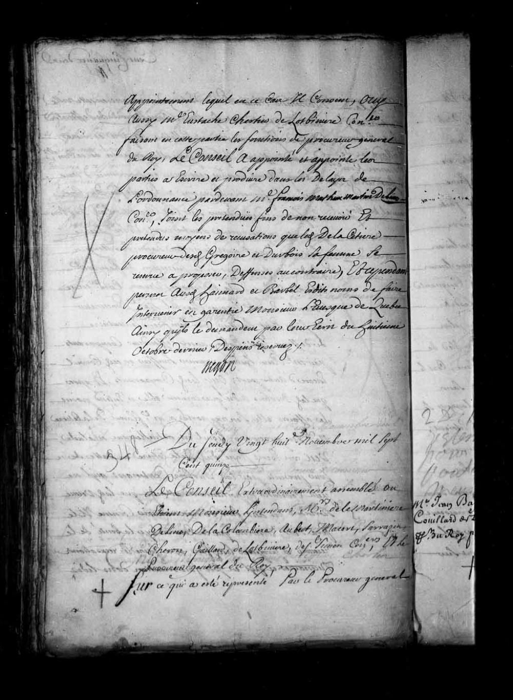 Transcription du texte avec orthographe modernisée : «Du jeudi vingt-huitième novembre mille sept cent quinze. Le Conseil extraordinairement assemblé où étaient Monsieur l'intendant Messieurs de la Martinière, Delino (De Lino) de la Colombière; Aubert, Macart (Macard), Sarrazin, Cheron, Gaillard, de Lotbinière, de Saint-Simon conseillers et le procureur général du Roi. Sur ce qui a été représenté par le procureur général du Roi que les boulangers ne font point le pain d'un poids ni de la qualité convenable, et qu'il serait à propos de faire un règlement à ce sujet qui put fixer le prix du pain blanc et du pain bis blanc, le Conseil a délibéré qu'il sera fait une épreuve de la quantité de pain blanc, et de pain bis blanc que peut produire un minot de blé, et ce en présence de maîtres Joseph de la Colombière (LaColombière) et Michel Sarrazin conseillers et du procureur général du Roi, à laquelle les boulangers de cette ville seront [...]