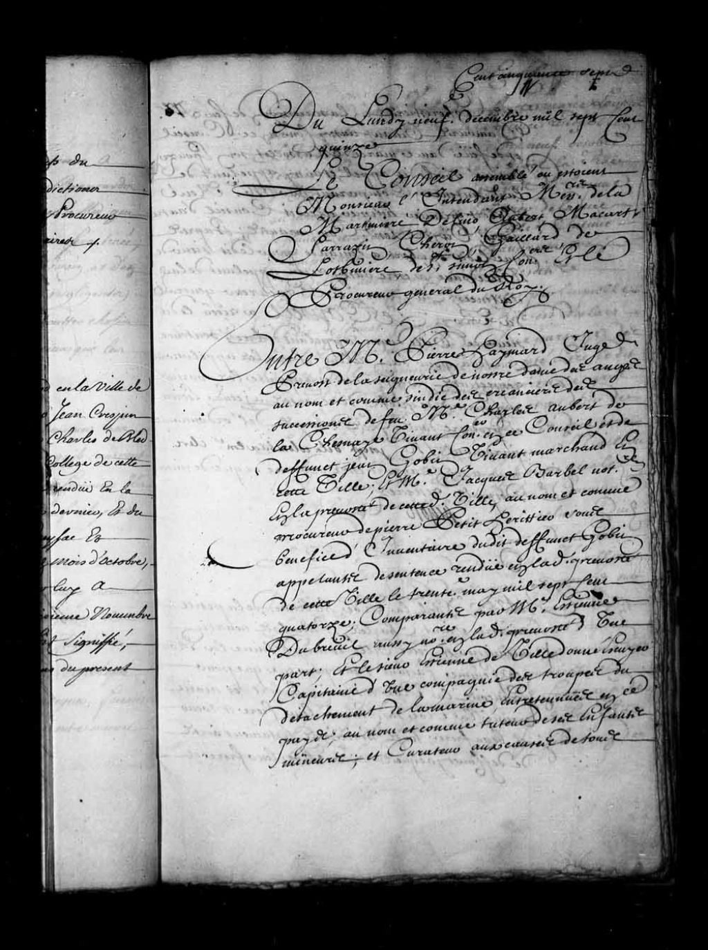 Transcription du texte avec orthographe modernisée : «Du lundi neuvième décembre mille sept cent quinze. Le Conseil assemblé où étaient Monsieur l'intendant, Messieurs de la Martinière, Delino (De Lino), Aubert, Macart (Macard), Sarrazin, Cheron, Gaillard, de Lotbinière, de Saint-Simon conseillers et le procureur général du Roi. Entre maître Pierre HAYMARD (Haimard, Émard) juge prévôt de la seigneurie de Notre-Dame-des-Anges au nom et comme syndic des créanciers des successions de feu maître Charles Aubert de Lachesnaie (Lachesnaye) vivant conseiller en ce Conseil, et de défunt Jean Gobin vivant marchand en cette ville; et maître Jacques BARBEL notaire en la prévôté de cette dite ville, au nom et comme procureur de Pierre Petit héritier sous bénéfice d'inventaire dudit défunt Gobin appelants de sentence rendue en ladite prévôté de cette ville le trentième mai mille sept cent quatorze; comparants par maître Etienne Dubreuil aussi notaire [...]