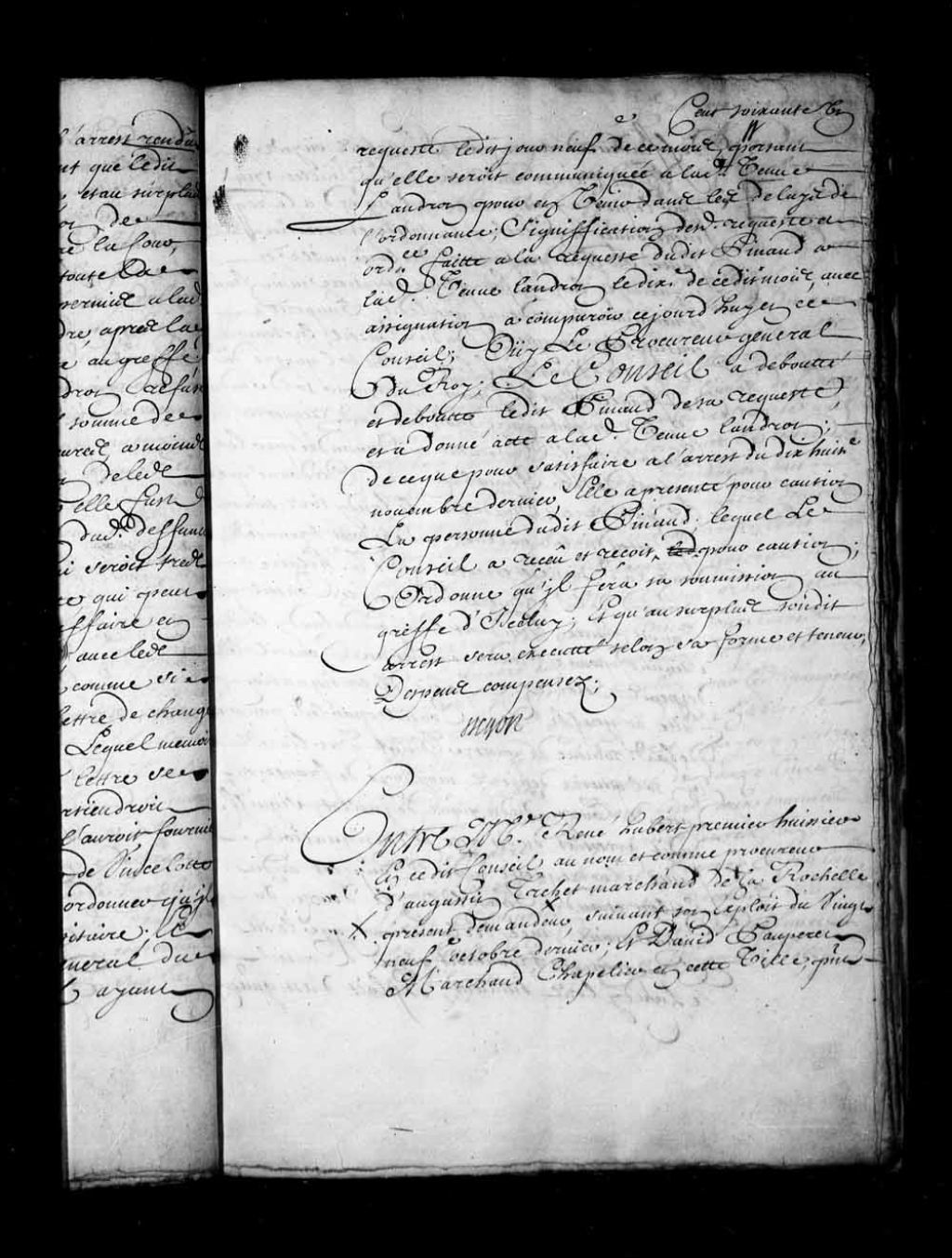- Transcription du texte avec orthographe modernisée : «Entre maître René HUBERT premier huissier en ce dit Conseil au nom et comme procureur de Augustin Trehet marchand de La Rochelle présent demandeur, suivant son exploit du vingt-neuvième octobre dernier; et David PAUPERET marchand chapelier en cette ville, présent défendeur d'autre part. Parties ouïes; vu l'arrêt rendu le neuvième juillet 1714 par lequel ayant aucunement égard à la requête mentionnée en icelui, la saisie et exécution faite sur ledit pauperet, est déclarée nulle, et injurieuse, lui en fait pleine et entière mainlevée, et néanmoins ordonné que ledit Pauperet consignerait au greffe dudit Conseil, la somme de quatre-vingt-neuf livres un sol quatre deniers de France; qu'il devait payer pour solde audit Hubert; et pour faire droit sur ladite requête; ensemble sur l'intervention demandée par la requête de maître Chambalon notaire; ordonné que les parties en viendraient le lundi lors suivant, et qu'attendu les nullités qui se sont trouvées dans ladite saisie et exécution; maître Hilaire Bernard de Larivière huissier en ce Conseil qui l'avait faite, viendrait ledit jour de lundi lors suivant, pour en rendre compte au Conseil; les dépens réservés; l'acte de consignation faite au greffe dudit conseil par ledit pauperet de ladite somme de quatre-vingt et une livres un sol quatre deniers, monnaie de France, en date du onzième dudit mois de juillet; signification dudit arrêt et dudit acte de consignation faite à la requête dudit Pauperet audit Hubert et audit Chambalon le douzième du même mois, avec déclaration que ledit Pauperet se trouverait en ce Conseil le lundi lors suivant; exploit d'assignation donnée à la requête dudit Hubert audit Pauperet ledit jour vingt-neuvième octobre dernier; ensemble l'exploit d'avenir donné audit Pauperet le onzième de ce mois; vu aussi un écrit signé dudit Chambalon en date du vingt-deuxième août dernier, par lequel il reconnaît avoir reçu dudit Hubert audit nom la somme de soixante-six livres quinze sols quatre deniers, pour solde du compte qui est en l'autre part dudit écrit; et trois livres de France, pour la requête, saisie, et sentence remise audit Hubert par ledit Chambalon, avec la lettre dudit Trehet du dixième juillet 1704 faisant en tout soixante-dix livres quinze sols quatre deniers du pays; dont il quitte et décharge ledit Hubert; ouï le procureur général du Roi; le Conseil a ordonné et ordonne que les quatre-vingt et une livres un sol quatre deniers monnaie de France, consignées au greffe d'icelui, par ledit pauperet, seront remises en les mains dudit Hubert; condamne ledit Pauperet à payer en outre audit Hubert la somme de douze livres aussi de France; faisant lesdites deux sommes celle de quatre-vingt-treize livres, un sol quatre deniers monnaie de France; pour laquelle ledit Pauperet aura son recours sur les biens de la communauté de défunt Philippe Basquien (Bastien) et Marie Jolly ci-devant sa veuve, et à présent femme dudit Pauperet; ordonné que ledit Hubert remettra audit Pauperet la procuration dudit Trehet et les pièces justificatives de sa créance; comme aussi que ledit Pauperet remettra audit Hubert, l'arrêt, quittance, et les pièces justificatives de la créance, de Jenverin sur ledit Trehet; et à l'égard des dépens faits de part et d'autre, depuis que ledit Hubert a levé l'exécutoire dont il s'agît; ordonne que ceux faits par ledit pauperet seront par lui seul et en son nom, supportés; et l'a condamné aussi en son non, en ceux faits par ledit Hubert; à l'exception des frais de la saisie et exécution que le Conseil a déclaré nulle par son arrêt du neuf juillet mille sept cent quatorze; comme aussi condamne ledit Pauperet au coût du présent arrêt. BEGON.»