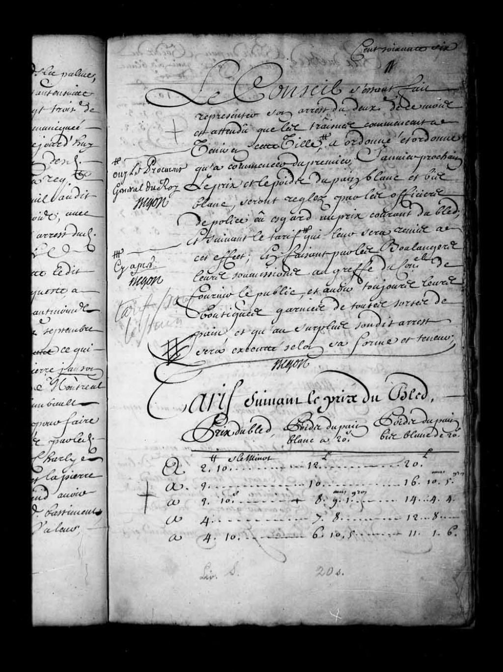 Transcription du texte avec orthographe modernisée : «Le Conseil s'étant fait représenter son arrêt du deuxième de ce mois et attendu que les traînes commencent à venir en cette ville, ouï le procureur général du Roi a ordonné et ordonne qu'à commencer du premier janvier prochain le prix et le poids du pain blanc et bis blanc, seront réglés par les officiers de police, eu égard au prix courant du blé; et suivant le tarif ci-après qui leur sera remis à cet effet; en faisant par les boulangers leurs soumissions au greffe du Conseil de fournir le public, et avoir toujours leurs boutiques garnies de toutes sortes de pain, et qu'au surplus sondit arrêt sera exécuté selon sa forme et teneur. BEGON.»