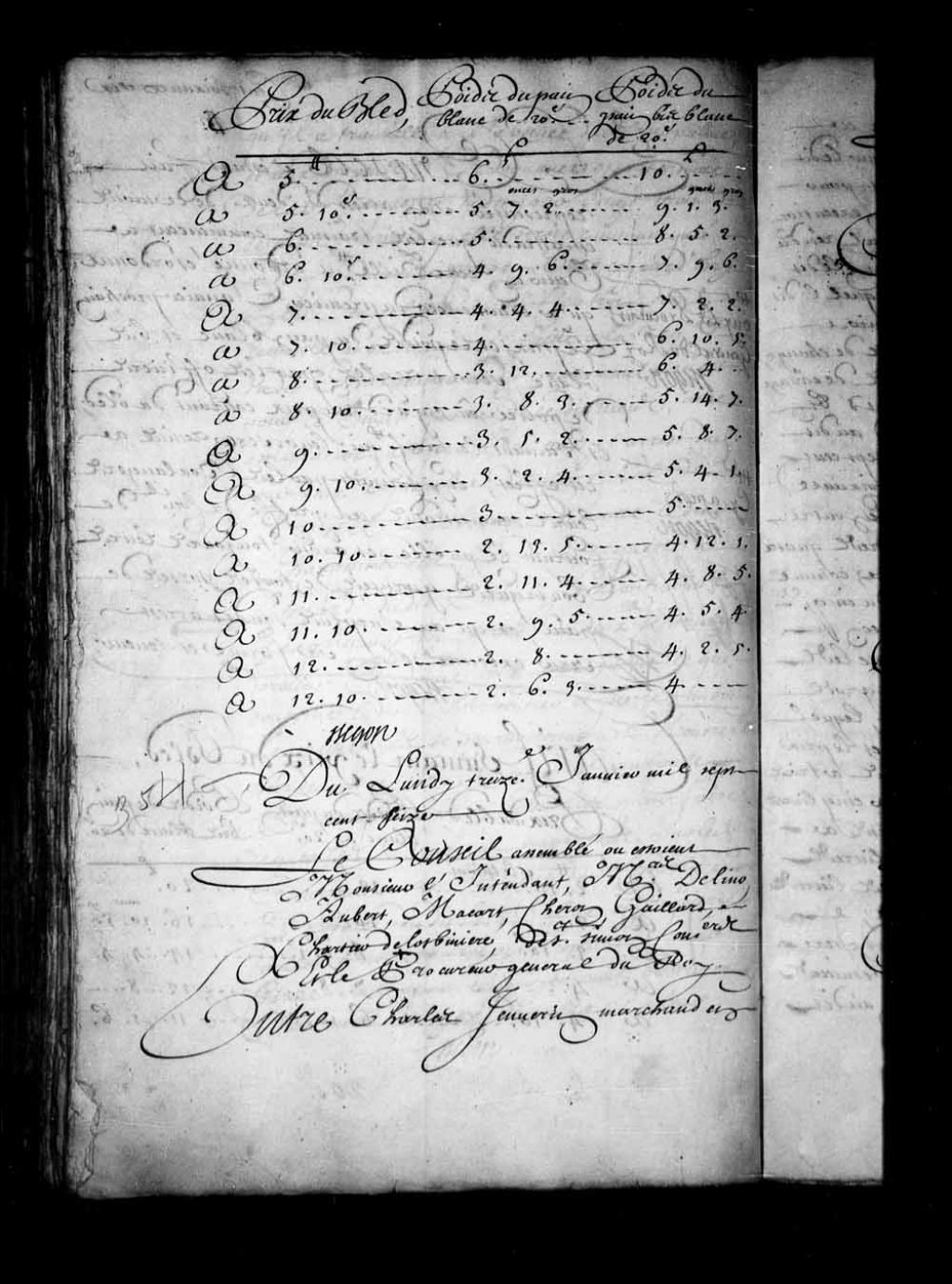 - Transcription du texte avec orthographe modernisée : «Du lundi treizième janvier mille sept cent seize. Le Conseil assemblé où étaient Monsieur l'intendant, Messieurs Delino (De Lino), Aubert, Macart (Macard), Cheron, Gaillard, Chartier de Lotbinière, de Saint-Simon conseillers et le procureur général du Roi. Entre Charles JENVERIN (Janvrin) marchand en la ville de La Rochelle, anticipant, comparant par Jean Crespin (Crépin) marchand en cette ville d'une part; et le frère Charles deBLED gérant les affaires des pères jésuites du collège de cette dite ville, appelant de sentence rendue en la prévôté de cette dite ville, le onzième octobre dernier, et du jugement arbitral rendu par les sieurs Greysac et Normandin marchands le trente et unième dudit mois d'octobre et anticipé; comparant par maître Florent de Lacettierre (Lacetière) notaire en ladite prévôté d'autre part, ouïs lesdits comparants; vu ladite sentence par laquelle les parties sont renvoyées par-devant deux marchands, dont elles conviendraient, ou à faute de ce, qu'ils seraient nommés d'office, pour régler leurs contestations. les dépens compensés. signification de ladite sentence faite à la requête dudit Jenverin audit frère deBled le vingt et unième dudit mois d'octobre, avec sommation de nommer un arbitre pour visiter et estimer les pelleteries qu'il prétendait donner en payement audit jenverin, pour le payement de ses billets; et à quel prix il les doit prendre en payement, conformément auxdits billets; et déclaration que ledit Jenverin nomme de sa part; pour arbitre ledit sieur Gabriel Greysac; exploit d'assignation donnée à la requête dudit Jenverin audit frère deBled le vingt-cinquième dudit mois d'octobre, à comparaître en ladite prévôté, pour voir nommer de sa part, un arbitre d'office; déclaration faite à l'instant par ledit de LaCettierre, pour ledit frère deBled, qu'il nomme de sa part pour arbitre ledit sieur Pierre Normandin en exécution de ladite sentence; le jugement arbitral rendu par lesdits sieurs Greysac et Normandin ledit jour trente et unième octobre dernier, par lequel ledit frère deBled est a condamné à fournir incessamment audit Jenverin lettres de change, des charges indispensables, ou lettres de change du bureau des castors, pour le montant d'un billet fait par ledit frère deBled audit Jenverin le vingt-cinquième octobre mille sept cent treize, de la somme de quatorze cent soixante-cinq livres monnaie de France; et en outre de payer la somme de cent dix-sept livres quatre sols pour la demeure de ladite somme, comme il s'y est obligé par un autre billet du cinquième novembre mille sept cent quatorze, ou en pelleteries marchandes, au cours que les marchandises ont été vendues en gros l'année dernière mille sept cent quinze, lequel cours est réglé à soixante pour-cent; et le prix des pelleteries; savoir les martres à trois livres dix sols; loutres et pécans à cinq livres, chats à trente sols; orignaux verts à vingt livres, cerfs verts à dix livres, ours à sept livres, oursons à trois livres dix sols; le tout monnaie du pays; déclaration faite par le révérend père Raffeix, procureur desdits pères jésuites qu'il n'a donné aucune commission audit frère deBled d'acheter des marchandises dudit Jenverin, que s'il l'a fait, ça été en son propre et privé nom, et qu'elles n'ont jamais entrées en la maison desdits pères jésuites; que si les billets dudit frère deBled portent ces mots; gérant les affaires des pères jésuites, c'est mal à propos, puisque ledit père Raffeix sait écrire, et qu'il n'Emprunte pas la main dudit frère deBled, ni son écriture, pour faire des emprunts de cette force, et promettre des payements de cette manière, d'autant plus que lui-même ne pourrait faire ses emprunts, sans l'autorité et le seing de son supérieur; ainsi qu'il est plus au long porté en ladite déclaration signifiée à la requête dudit père Raffeix audit Crespin audit nom, le deuxième novembre aussi dernier; autre signification de ladite déclaration et de l'exploit étant ensuite faite à la requête dudit Crespin audit frère deBled, le cinquième dudit mois de novembre; déclaration faite à l'instant par ledit frère deBled qu'il se rendait appelant en ce Conseil de ladite sentence, et dudit jugement arbitral; pour les torts et griefs à lui faits par iceux; requête présentée en ce Conseil par ledit Jenverin, aux fins d'être reçu anticipant; sur ledit appel; ordonnance étant ensuite du vingt-troisième dudit mois de novembre par laquelle ledit jenverin est reçu anticipant, pour en venir à jour certain et compétent; signification desdites requête et ordonnance faite à la requête dudit Crespin audit nom, audit frère deBled ledit jour vingt-troisième novembre avec assignation en ce Conseil; défaut obtenu en ce Conseil le deuxième décembre aussi dernier par ledit jenverin contre ledit frère deBled, signifié audit frère deBled le quatrième de ce mois, avec assignation à comparaître ce jourd'hui en ce Conseil; vu aussi les billets signés dudit frère deBled, l'un de ladite somme de quatorze cent soixante-cinq livres du vingt-huitième octobre 1713 et l'autre de celle de cent dix-sept livres quatre sols du cinquième novembre 1714 au profit dudit Jenverin, et les autres pièces sur lesquelles ladite sentence et jugement arbitral ont été rendus; ouï le procureur général du Roi; le Conseil a mis et met l'appellation au néant; émendant évoquant le principal, et y faisant droit, a homologué et homologue l'avis des arbitres nommés et convenus par les parties en date du trente et unième octobre dernier; ordonne qu'il sera exécuté selon sa forme et teneur, à l'effet de quoi la minute d'icelui restera au greffe dudit Conseil, et a condamné ledit Charles deBled audit nom aux dépens. BEGON.»