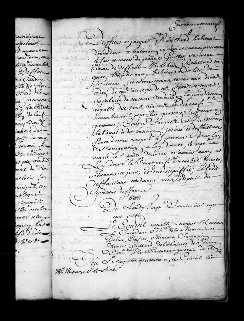 - Transcription du texte avec orthographe modernisée : «Du lundi vingtième janvier mille sept cent seize. Le Conseil assemblé où étaient Monsieur l'intendant; Messieurs de la Martinière, Delino (De Lino), Aubert, Macart (Macard), Sarrazin, Cheron, Gaillard, de Lotbinière, de Saint-Simon conseillers et le procureur général du Roi. Monsieur Macart (Macard) s'est retiré. Vu la requête présentée en ce Conseil le treizième de ce mois, par Pierre Trottier Desauniers (Desaulniers) marchand à Montréal, tendante pour les raisons y contenues à ce qu'il plaise à la Cour remettre ledit Trottier en pareil et semblable état qu'il était auparavant l'arrêt rendu entre lui et Pierre de LESTAIGE (Lestage) aussi marchand audit Montréal, en date du premier juillet dernier; le tenir pour rapporté; ce faisant ordonner que la procédure sera revue, et examinée, de nouveau, et faisant droit au fond, condamner ledit LESTAIGE (Lestage) à lui payer les fleurs de [...]