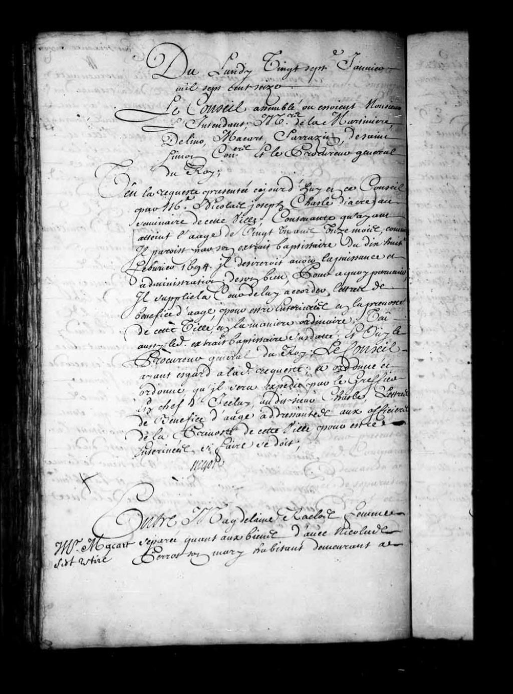 - Transcription du texte avec orthographe modernisée : «Monsieur Macart (Macard) s'est retiré. Entre Madeleine RACLOS femme séparée quant aux biens d'avec Nicolas Perrot (Perrault) son mari habitant demeurant à Beccancourt demanderesse en requête par elle présentée en ce Conseil le trentième septembre dernier; comparante par ledit Perrot d'une part; et François CHOREL D'ORVILLIERS (Dorvilliers) marchand demeurant à Champlain, défendeur sur ladite requête, et demandeur en saisie faite à sa requête, entre les mains de maître Pierre Hazeur Delorme cure dudit lieu de Champlain en date du vingt-septième août mille sept cent quinze; présent en personne d'autre part; et encore ledit Chorel d'Orvilliers demandeur d'une part; et ledit Nicolas PERROT présent défendeur, reçue partie intervenante par arrêt du vingtième de ce mois encore d'autre part; ouïs lesdits comparants; vu ledit arrêt par lequel ledit d'Orvilliers est reçu appelant de la sentence de séparation dudit Perrot et de ladite Raclos; et ledit Perrot partie intervenante; et ordonné qu'ils se communiqueraient respectivement de la main à la main, les pièces dont ils entendaient se servir; pour en venir ce jourd'hui en ce Conseil; comme aussi est accordé à ladite Madeleine Raclos, une provision de la somme de deux cents livres monnaie du pays; sur les deniers qui sont en les mains dudit sieur Delorme, nonobstant la saisie sur lui faite à la requête dudit d'Orvilliers; vu aussi les communications respectives faites par lesdites parties de la main à la main, des pièces dont elles prétendent se servir; ensemble les défenses dudit d'Orvilliers contre ladite Raclos en date de ce jour; signées de lui; celles de ladite Raclos, contre ledit d'Orvilliers signées dudit Perrot; et celles dudit Perrot intervenant; signées de lui aussi en date de ce jour; sur la demande à lui faite par ledit d'Orvilliers; ouï le procureur général du Roi; le Conseil avant faire droit à ordonne et ordonne que ladite raclos rapportera le testament de Colette Raclos du neuvième juillet mille six cent quatre-vingt-sept; et les autres pièces qui ont rapport au legs à elle fait, et au payement qui en a été fait; et sur ce qui a été représenté par ledit Perrot, que ledit testament et les autres pièces qui y ont rapport sont en les mains dudit sieur Hazeur Delorme curé de Champlain; le Conseil ordonne que lesdites pièces seront délivrées à ladite raclos par ledit sieur Delorme à la première réquisition qui lui en sera faite à la requête de ladite Raclos en présence de deux témoins; et au surplus que son arrêt du vingtième de ce mois sera exécuté en ce qui concerne la provision accordée à ladite raclos de la somme de deux cents livres; monnaie du pays sur ledit sieur Delorme, et sur la demande verbale dudit d'Orvilliers, à être reçu appelant de la sentence d'adjudication des habitations vendues sur ledit Perrot; le Conseil a reçu et reçoit ledit d'Orvilliers appelant de ladite sentence d'adjudication et de tout ce qui s'en est ensuivi; l'a tenu pour bien relevé; et lui permet de lever au greffe de la juridiction royale des Trois-Rivières ou ailleurs les pièces par lui demandées à ladite Raclos; et en ce qui regarde l'action intentée par ledit d'Orvilliers contre ledit Perrot; ordonne que ledit d'Orvilliers rapportera dans quinzaine au greffe de ce Conseil, les livres et registres de feu son père; pour iceux examinés être fait droit; ainsi que de raison; dépens réservés. BEGON.»
