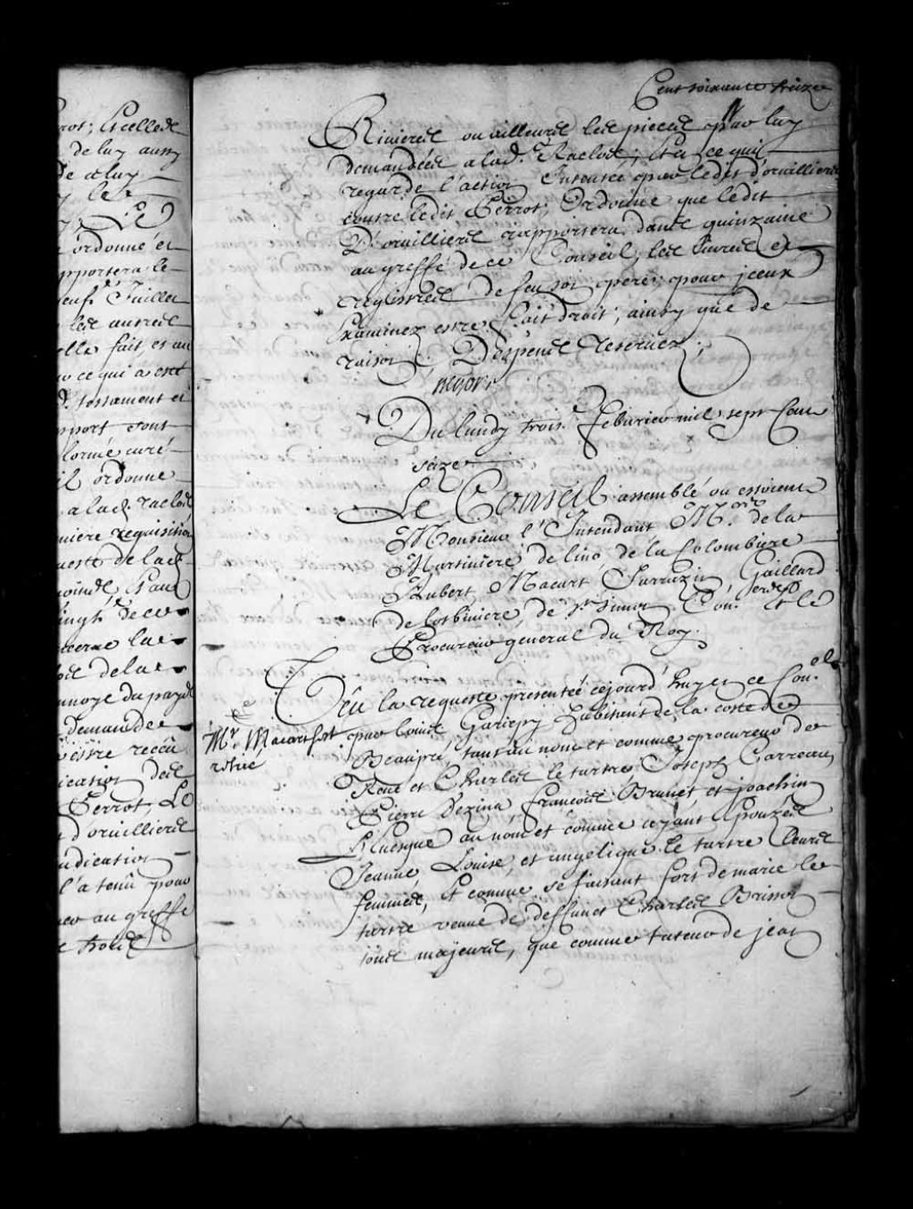 - Transcription du texte avec orthographe modernisée : «Du lundi troisième février mille sept cent seize. Le Conseil assemblé où étaient Monsieur l'intendant, Messieurs de la Martinière, Delino (De Lino), de la Colombière, Aubert, Macart (Macard), Sarrazin, Gaillard de Lotbinière, de Saint-Simon, conseillers et le procureur général du Roi. Monsieur Macart (Macard) s'est retiré. Vu la requête présentée ce jourd'hui en ce Conseil par Louis Gariepy habitant de la côte de Beaupré, tant au nom et comme procureur de René et Charles Letartre, Joseph Carreau. Pierre Vezina, François Brunet et Joachim Lévesque au nom et comme ayant épousés Jeanne, Louise, et Angélique Letartre leurs femmes, et comme se faisant fort de Marie Letartre veuve de défunt Charles Brisson tous majeurs, que comme tuteur de Jean Augustin, Joseph, Athanase, et Marguerite Letartre, tous enfants mineurs de défunt Charles Letartre, aussi habitant de ladite seigneurie de Beaupré [...]