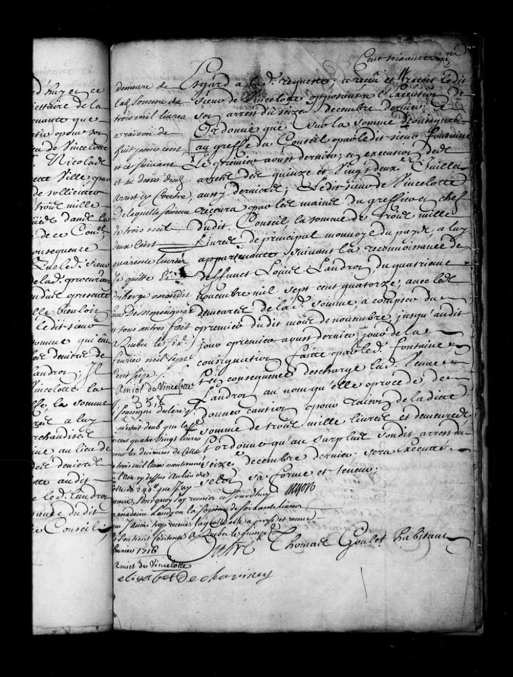 - Transcription du texte avec orthographe modernisée : «Monsieur Macart (Macard) est rentré et Monsieur Gaillard s'est retiré. Entre Thomas GOULET habitant de Lachesnaie (Lachenaie) anticipant; Comparant par Joseph Goulet son frère d'une part; et Louis AUDI (Odet) écuyer sieur de BAILLEUIL (Bayeul, Bailleul), lieutenant d'une compagnie des troupes de la marine en ce pays; et dame Marie Anne TROTTIER son épouse, auparavant veuve de défunt Raymond Martel, vivant propriétaire de la seigneurie de Lachesnaye; Pierre TROTTIER DESAUNIERS (Desaulniers), marchand à Montréal, au nom et comme tuteur des enfants mineurs dudit défunt Martel, et encore comme héritier de défunt Antoine Trottier son père; Guillaume et François BAUDOUIN (Beaudoin) habitants de ladite seigneurie; appelants de sentences rendues en la juridiction royale dudit Montréal, les quatorzième août 1708 quatorzième juin 1709 trentième juin, onzième et douzième juillet 1713 et d'ordonnances de ladite juridiction rendues les douzième mai et vingtième juillet 1714 et anticipés; comparants par maître Florent de LaCettierre notaire en la prévôté de cette ville faisant tant pour lesdits appelants, que pour tous les autres créanciers dudit défunt Martel, d'autre part; ouïs lesdits comparants; et après qu'ils ont consenti que maîtres François Aubert, et Charles Macart (Macard) conseillers qui voulaient se retirer demeurent juges; vu la sentence dudit jour quatorzième juin 1709 par laquelle il est ordonné que ledit Goulet jouirait de son habitation en question suivant l'alignement et bornage fait et tiré par les sieurs Buisson et radisson mentionné en la missive dudit sieur Buisson, et procès-verbal dudit sieur Radisson; les dépens compensés. Autre sentence dudit jour douzième juillet 1713 par laquelle sans avoir égard aux procès-verbaux d'arpentage du nommé la Cerisaye (Lassiseraie), juré arpenteur des quatre concessions situées à la rivière de L'Assomption produits par ledit François Baudouin; il est ordonné que la sentence dudit jour quatorzième juin 1709 sortira sa force et teneur; avec défenses audit François Baudouin de prendre aucuns bois sur la concession dudit Thomas Goulet, sous telle peine qu'il appartiendra; les dépens compensés par moitié taxés à seize livres cinq sols de France; signification de ladite sentence faite à la requête dudit Thomas Goulet audit François Baudouin le vingt-septième dudit mois de juillet; actes d'appel en ce Conseil des sentences et ordonnances ci-devant datées, signifiés à la requête desdits appelants, audit Thomas Goulet les deuxième août mille sept cent treize et vingtième août mille sept cent quatorze; requête présentée en ce Conseil par ledit Goulet, aux fins d'être reçu anticipant sur lesdits appels, ordonnance étant ensuite du dix-huitième octobre de ladite année mille sept cent quatorze, par laquelle ledit Goulet est reçu anticipant à lui permis de faire assigner pour en venir à certain et compétent jour de Conseil signification desdites requête et ordonnance faite à la requête dudit Thomas Goulet auxdits appelants le vingt-neuvième décembre de ladite année, avec assignation en ce Conseil; exploit d'avenir donné à la requête dudit Goulet audit de LaCettierre procureur desdits appelants le dix-huitième février mille sept cent quinze, arrêt rendu en ce Conseil le onze mars ensuivant par lequel il est ordonné avant faire droit que ledit Thomas Goulet rapporterait le contrat de la concession qui lui a été faite par feu le sieur de Lachesnaye, le procès-verbal de bornage de sa dite terre, et le plan tant d'icelle terre, que de celles de René Goulet desdits Baudouin et autre qui serait dressé entre eux, parties présentes ou dûment appelées; pour le tout vu être par le Conseil ordonné ce que de raison; les dépens réservés; signification dudit arrêt faite à la requête dudit Goulet audit de LaCettierre auxdits noms, le treizième juillet de ladite année mille sept cent quinze; avec assignation en ce Conseil; exploit d'avenir donné audit de LaCettierre à la requête dudit Goulet le vingtième dudit mois; autre signification dudit arrêt faite à la requête dudit Thomas Goulet et dudit René Goulet; auxdits François et Guillaume Baudouin frères le neuvième octobre dernier; avec sommation à eux de se trouver pour aider à tirer les lignes avec lesdits Goulet sur les bornes plantées par ledit Radisson, ensemble montrer les bornes qui ont été plantées par ledit de La Cerizaie et pour voir tirer le plan des terres et du marais en question pour le tout être présenté en ce Conseil; pour faire droit à qui il appartiendrait; un contrat de concession donnée par le sieur Dailleboust de Menthet (Manthet) faisant pour feu le sieur de Lachesnaye, audit Thomas Goulet d'une terre sise en la seigneurie de Lachesnaye, de trois arpents de front sur vingt arpents de profondeur; ledit contrat passé par-devant maîtres Adhémar et Raimbault notaires royaux le vingt-huitième juillet 1699. Un plan dressé par Gilles Papin arpenteur royal, des habitations de René et Thomas Goulet, et de celles de François et Guillaume Baudouin; ensuite duquel est un procès-verbal fait par ledit papin en présence desdits Goulet et de François Baudouin, faisant tant pour lui que pour Guillaume Baudouin son frère; en date dudit jour neuvième octobre dernier; ledit procès-verbal signé, Thomas Goulet, Bourdon huissier; et G. Papin arpenteur royal, lesdits René Goulet et François Baudouin ayant déclarés ne savoir signer; par lequel il paraît entre autres choses, que ledit papin s'est fait montrer les bornes plantées par le sieur radisson arpenteur; et a tiré des lignes de profondeur sur lesdites bornes qui courent. nord-ouest, sud-est; treize à quatorze degrés de Variation; et qu'ensuite s'étant aussi fait montrer les bornes plantées par le sieur de La Cerizaie aussi arpenteur; il y a de même tiré le