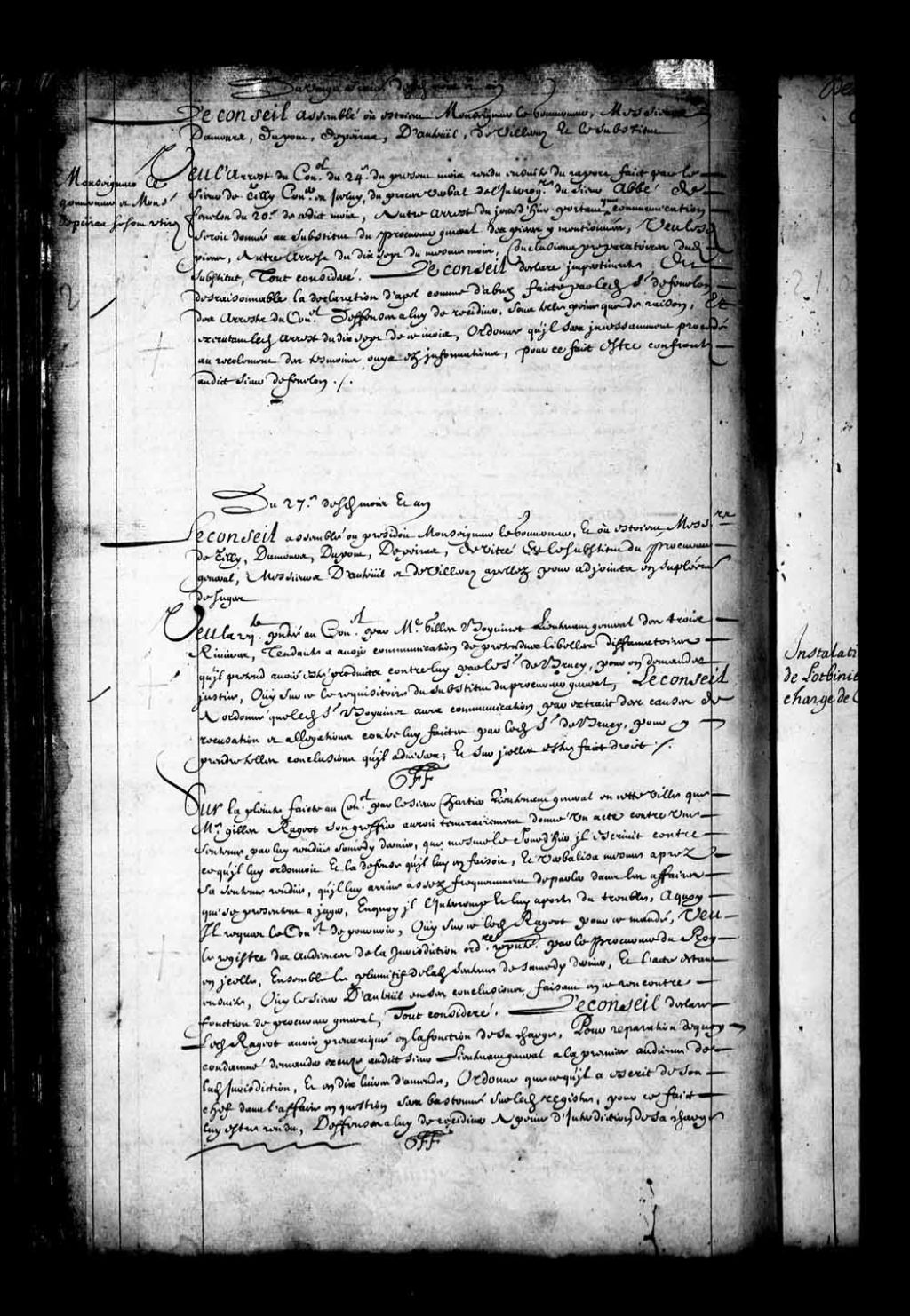 - Transcription du texte avec orthographe modernisée : «Sur la plainte faite au Conseil par le sieur Chartier lieutenant général en cette ville que maître Gilles Rageot son greffier, aurait témérairement donné un acte contre une sentence par lui rendue samedi dernier, que même le jourd'hier il écrivit contre ce qu'il lui ordonnait et la défense qu'il lui en faisait, et verbalisa même après sa sentence rendue, qu'il lui arrive assez fréquemment de parler dans les affaires qui se présentent à juger, en quoi il l'interrompt et lui apporte du trouble, à quoi il requiert le Conseil de pourvoir; ouï sur ce ledit Rageot pour ce mandé; vu le registre des audiences de la juridiction ordinaire représenté par le procureur du Roi en icelles, ensemble le plumitif de ladite sentence de samedi dernier, et l'acte étant ensuite; ouï le sieur d'Auteuil en ses conclusions, faisant en ce rencontre fonction de procureur général, tout considéré. Le Conseil [...]