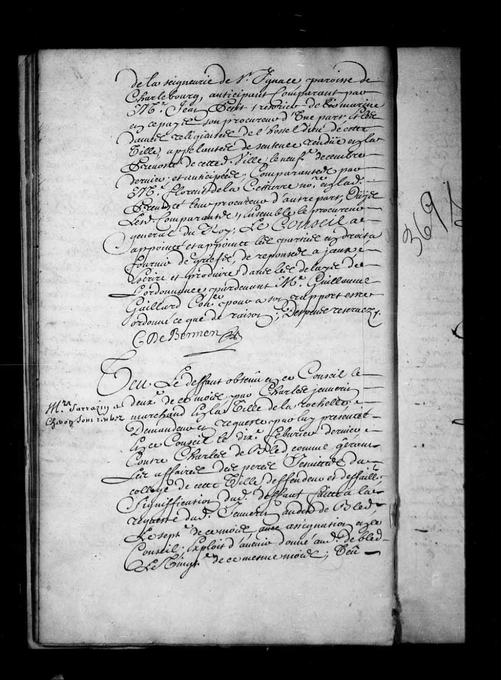 - Transcription du texte avec orthographe modernisée : «Messieurs Sarrazin et Cheron sont rentrés. Vu le défaut obtenu en ce Conseil le deuxième de ce mois, par Charles jenverin (Janvrin) marchand en la ville de La Rochelle; demandeur en requête par lui présentée en ce Conseil le dixième février dernier, contre Charles deBled, comme gérant les affaires des pères jésuites du collège de cette ville, défendeur et défaillant; signification dudit défaut faite à la requête dudit Jenverin audit deBled, le septième de ce mois, avec assignation en ce Conseil; exploit d'avenir donné audit debled le vingtième de ce même mois; vu aussi ladite requête, tendante pour les raisons y contenues, à ce que ledit debled soit condamné aux intérêts, ou demeure des sommes de quatorze cent soixante-cinq livres et cent dix-sept livres monnaie de France, portées par jugement arbitral du trente et unième octobre dernier, et arrêt d'homologation du treizième janvier aussi dernier; et ce du jour de la demande en justice; suivant la requête du vingt-troisième novembre aussi dernier, jusqu'à l'actuel payement desdites sommes principales, et aux dépens; ordonnance étant ensuite de ladite requête dudit jour dixième février dernier; portant qu'elle serait communiquée audit deBled pour en venir dans les délais de l'ordonnance; signification desdites requête et ordonnance faite à la requête dudit Jenverin audit de blé le dix-huitième dudit mois avec assignation en ce Conseil; et après que Jean Crespin marchand en cette ville, faisant pour ledit Jenverin; a requis le profit dudit défaut; et que ledit deBled n'a comparu ni personne pour lui; ouï le procureur général du Roi; le Conseil a déclaré et déclare le défaut dudit jour deuxième de ce mois, bien et dûment obtenu; et en adjugeant le profit d'icelui, condamne ledit Charles de blé, aux intérêts de ladite somme de quatorze cent soixante-cinq livres, seulement de principal, à compter du vingt-troisième novembre dernier, jour de la demande, jusqu'à l'actuel payement, et aux dépens. C. DE BERMEN»