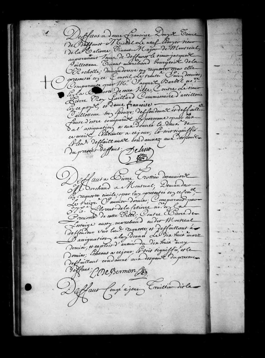 Transcription du texte avec orthographe modernisée : «Défaut à Pierre Trottier Desauniers (Desaulniers) marchand à Montréal, demandeur en requête civile, par lui présentée en ce Conseil; le treizième janvier dernier; comparant par maître Florent de Lacettierre (Lacetière) notaire en la prévôté de cette ville; contre Pierre de LESTAIGE (Lestage) aussi marchand audit Montréal, défendeur sur ladite requête, et défaillant à l'assignation à lui donnée le dix-huitième mars dernier; et exploit d'avenir du dix-huitième mai dernier; échéant à ce jour; et soit signifié, et le défaillant condamné aux dépens du présent défaut. C. DE BERMEN»