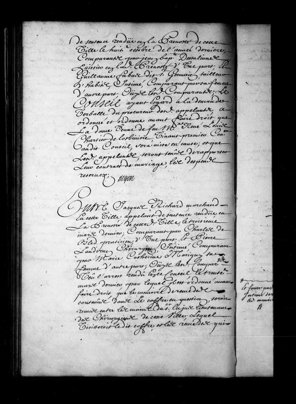 - Transcription du texte avec orthographe modernisée : «Entre Jacques RICHARD marchand en cette ville, appelant de sentence rendue en la prévôté de cette dite ville, le troisième mars dernier; comparant par Charles deBled praticien, d'une part; et Pierre LANDIRAN (Andiran) chirurgien, intimé, comparant par Marie Catherine Marigny sa femme d'autre part; ouïs lesdits comparants vu l'arrêt rendu en ce Conseil, le trentième mars dernier, par lequel il est ordonné avant faire droit, que le mémoire de remèdes contenus dans le coffre en question, serait remis entre les mains du sieur Lajus lieutenant des chirurgiens de cette ville; lequel visiterait ledit coffre, et les remèdes qui y sont; et en dresserait son rapport; qu'il viendrait affirmer en ce Conseil, le lundi lors suivant; auquel jour ledit appelant ferait aussi comparaître en ce dit Conseil les matelots qui ont portés ledit coffre en la maison dudit intimé; pour ce fait être ordonné ce qu'il appartiendrait; les dépens réservés; signification dudit arrêt, faite à la requête dudit intimé audit appelant le dix-huitième avril aussi dernier; exploit de sommation faite audit appelant le neuvième mai ensuivant de retirer de chez ledit intimé, le coffre de remèdes en question, et de le payer de son dû; et déclaration que faute par ledit appelant d'avoir satisfait audit arrêt, ledit intimé ferait vendre lesdits remèdes le lundi lors suivant, huit heures du matin, sans autre remise; à ce que ledit appelant eût à y faire trouver enchérisseur; le Conseil avant faire droit, en expliquant son arrêt du trentième mars dernier; a ordonné et ordonne que le mémoire des remèdes contenus dans le coffre en question sera remis par ledit intimé, entre les mains du sieur LaJus chirurgien; à l'effet de visiter par lui ledit coffre, et vérifier s'il y a la même quantité et qualité de remèdes portés sur ledit mémoire; et faute par ledit intimé de représenter ledit mémoire, le Conseil ordonne que ledit Lajus s'informera dans quelle apothicairerie, lesdits remèdes ont été achetés; et demandera ledit mémoire, à celui qui aura fourni lesdits remèdes, pour sur icelui faire ladite vérification, et en cas qu'il ne puisse avoir ledit mémoire d'aucune manière; il fera un état de la quantité et qualité de chacun des remèdes qui se trouveront dans ledit coffre, et en marquera l'estimation, suivant leur valeur; au temps qu'ils ont été achetés; et du tout, dressera son rapport, qu'il viendra affirmer, en ce Conseil, lundi prochain, auquel jour sera fait droit, aux parties; dépens réservés. BEGON.»