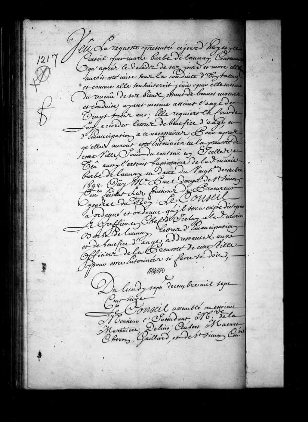 - Transcription du texte avec orthographe modernisée : «Du lundi septième décembre mille sept cent seize. Le Conseil assemblé où étaient Monsieur l'intendant, Messieurs de la Martinière, Delino (De Lino), Aubert, Macart (Macard), Cheron, Gaillard, et de Saint-Simon conseillers. ce dernier faisant les fonctions de procureur général du Roi. Vu par le Conseil la concession donnée à titre de fief et seigneurie, haute, moyenne, et basse justice, à Monsieur le marquis de Vaudreuil ci-devant gouverneur de Montréal et à présent gouverneur général en ce pays de la Nouvelle-France, le vingt-troisième octobre 1702 par feu Monsieur le chevalier de Callières gouverneur général, et Monsieur de Beauharnois pour lors intendant en ce dit pays, de la moitié d'une langue de terre, située au lieu dit Lapointe aux tourtres contenant quatre lieues de terre de front sur une lieue et demie de profondeur au plus large de ladite langue de terre, et une demie lieue [...]