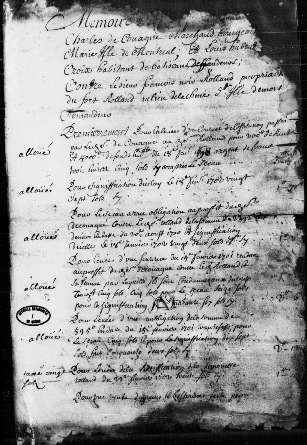 Mémoire des frais encourus par Charles de Couagne, marchand bourgeois, et Louis Hubert Lacroix, habitant de Batiscan, dans leur procès contre François Noir Rolland (LeNoir), 15 septembre 1703, Archives nationales à Québec, Fonds Conseil souverain, (03Q,TP1,S30,D1).