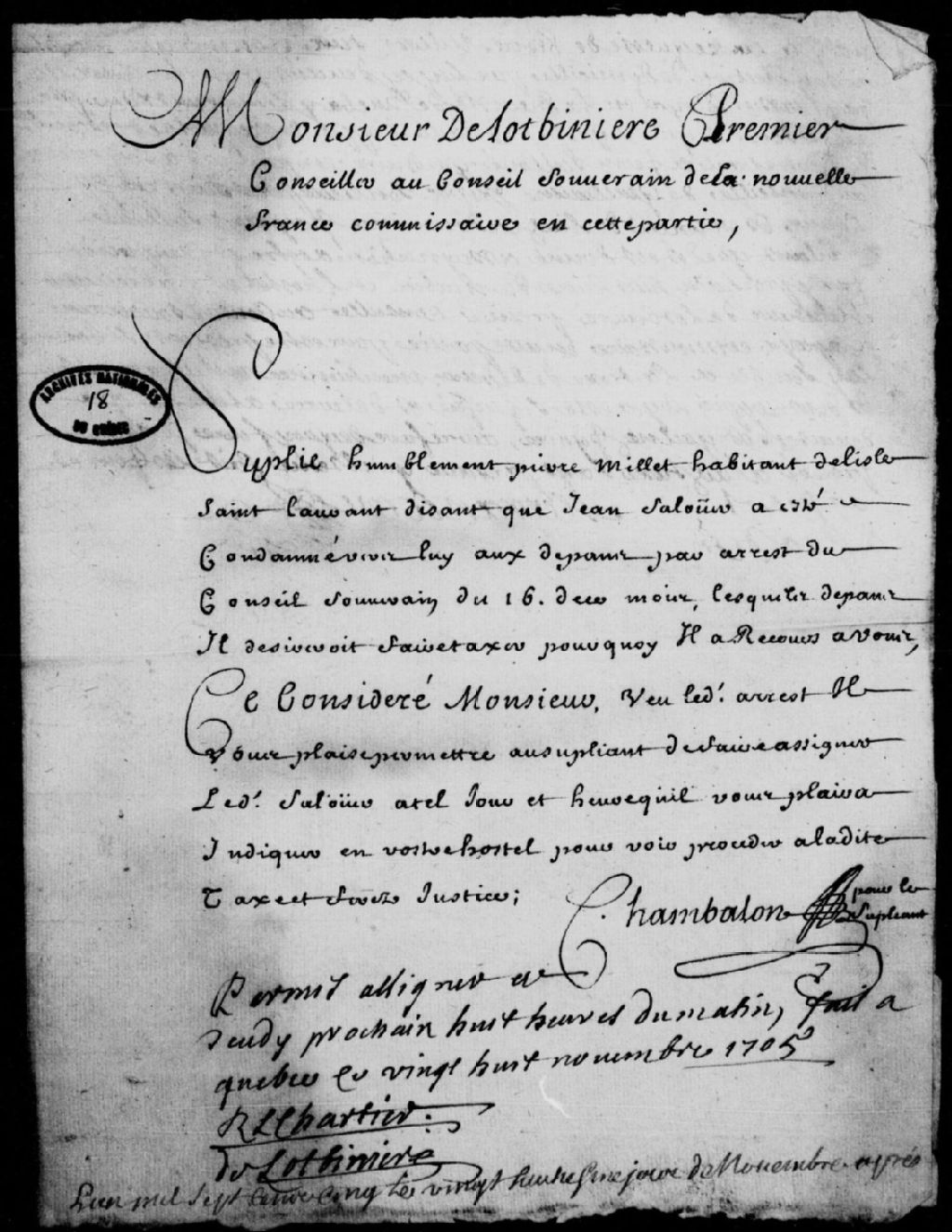 - Mémoire des dépens à payer par Jean Salloy (Salois), de Québec, à la requête de Pierre Milet (Millet), habitant de l'île Saint-Laurent (île d'Orléans), à la suite d'un arrêt du Conseil supérieur de Québec en date du 16 novembre 1705
