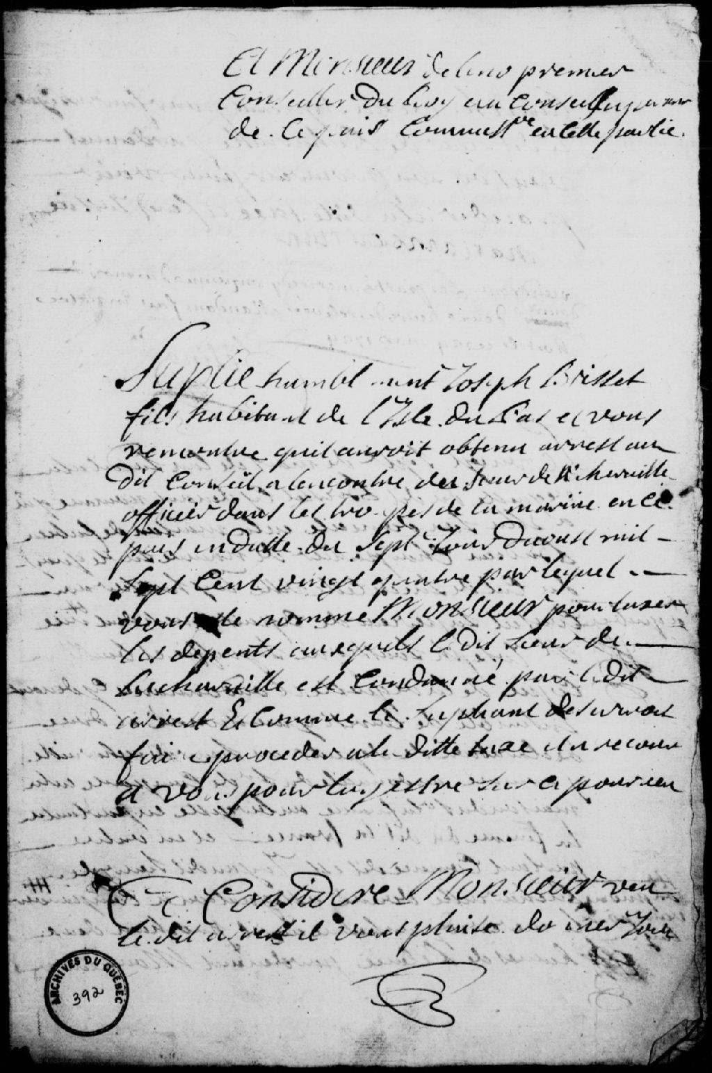- Mémoire des dépens à payer par Claude Drouet de Richerville (Richardville), officier des troupes de la Marine, à la requête de Joseph Brisset dit Beaupré fils, habitant de l'île Dupas, à la suite de l'arrêt du Conseil supérieur de Québec du 7 août 1724